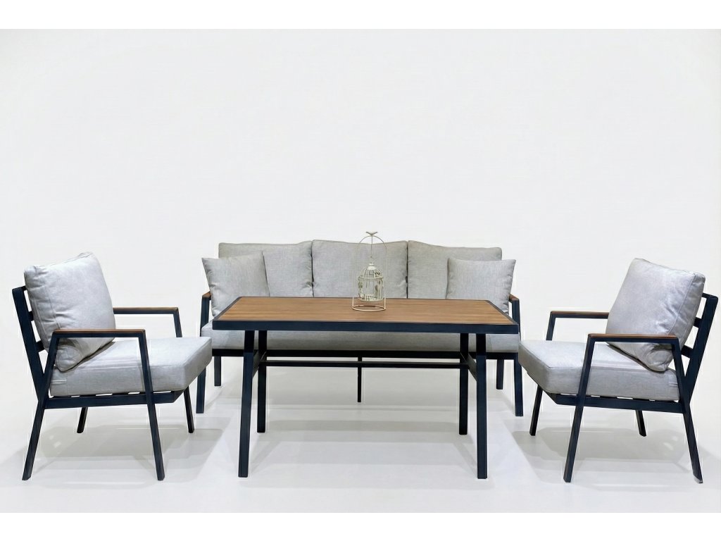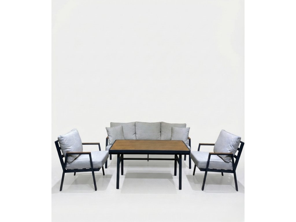 Záhradný set Athens vo väčšom prevedení predstavuje dokonalé spojenie štýlu, komfortu a kvality za prijateľnú cenu. Tento exteriérový set je ideálny pre záhrady, terasy či balkóny, kde sa oceňuje praktický a zároveň nadčasový dizajn. Sivá hliníková konštrukcia doplnená o podrúčky a stolovú dosku z dreva iroko vytvára moderný a prirodzený vzhľad, ktorý perfektne ladí s pohodlným pastelovo-sivým čalúnením.