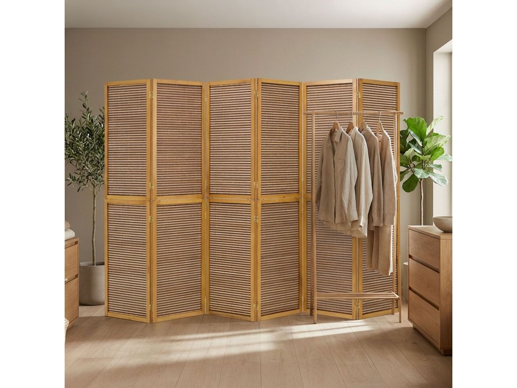 Bambusový paraván zaujme svojimi prvotriednymi materiálmi. Kvalitné drevo obložené bambusom vytvára prirodzenú atmosféru. Bambus je trvanlivý prírodný produkt, ktorý prirodzene vylepšuje každú oblasť bývania. Harmonický vzor je jemný a mimoriadne krásny. Tento bambusový paraván nie je len vizuálnym prvkom, ale má aj funkčný efekt ako deliaca priečka na ochranu súkromia alebo oddelenia priestoru. Vďaka pántom, ktoré sa dajú zložiť v oboch smeroch, je možné paraván ľahko a presne integrovať do obývacej izby alebo spálne podľa vašich individuálnych prianí. Ak paraván nie je potrebný, môže sa ľahko zložiť a šetriť tak priestor.