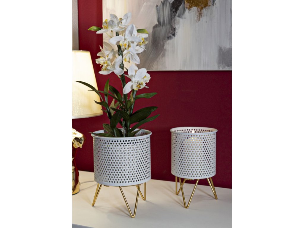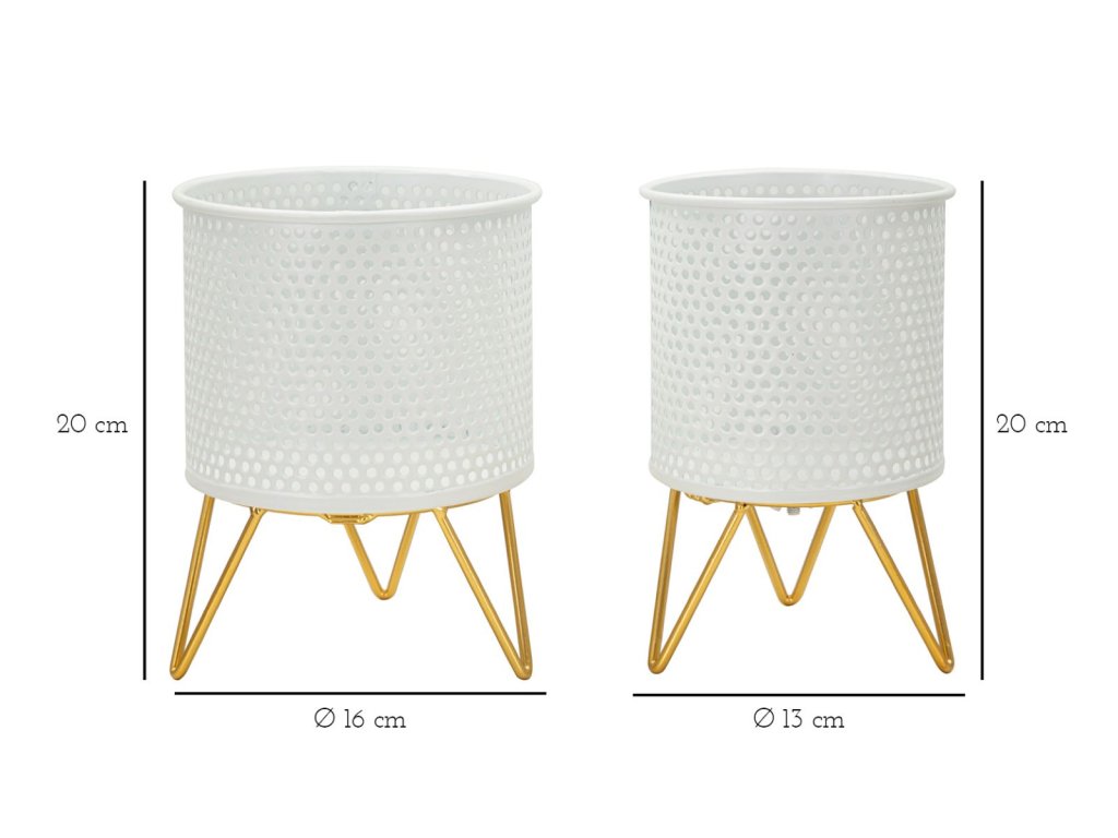 Set váz Gaspy spája čistý dizajn, jemnú eleganciu a praktické prevedenie. Biele kovové vázy sú zdobené pravidelnými okrúhlymi výrezmi, ktoré pôsobia moderne a dodávajú dekorácii zaujímavý svetelný efekt. Každá váza je umiestnená na stabilnom zlatom kovovom stojane, ktorý celku dodáva luxusný a harmonický vzhľad.