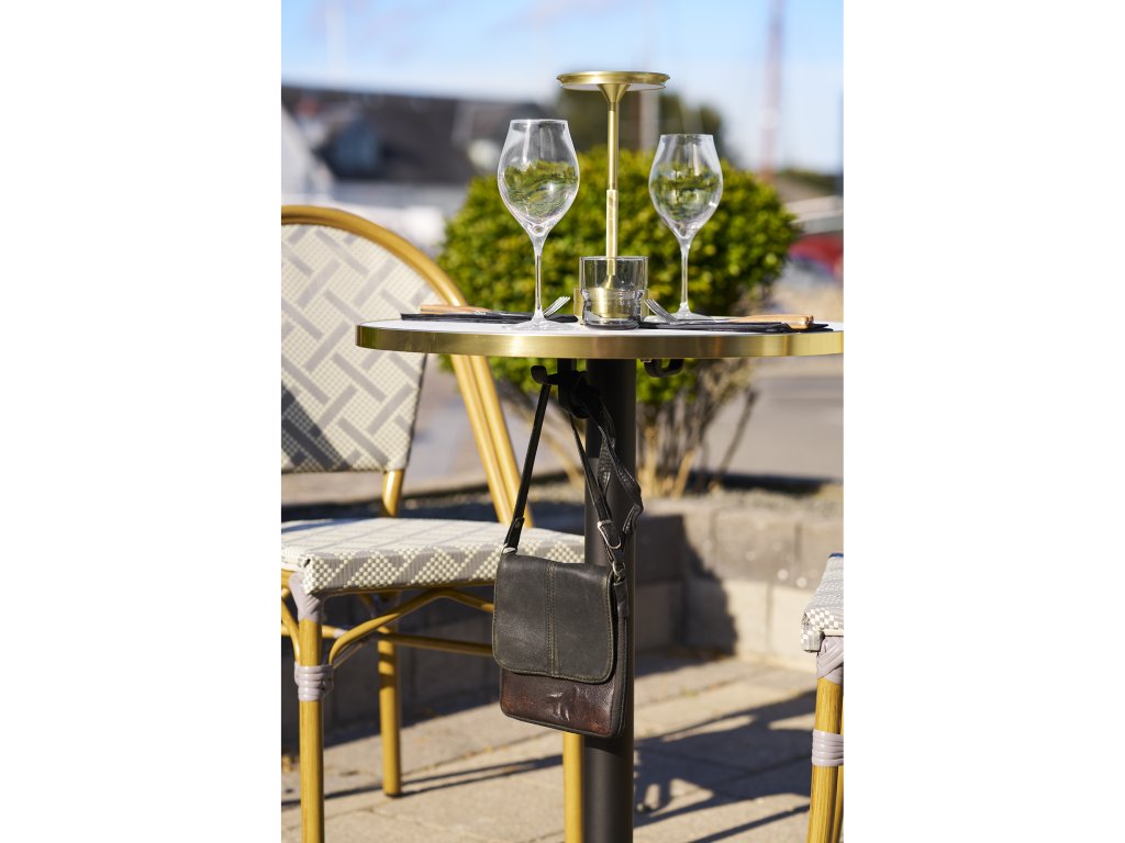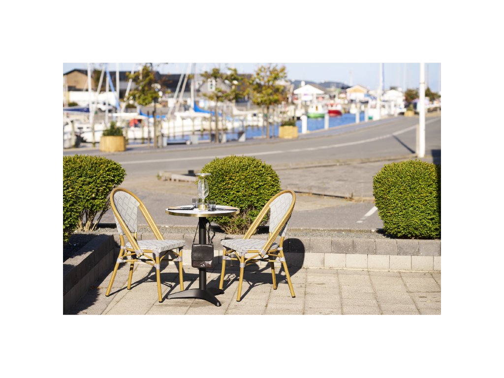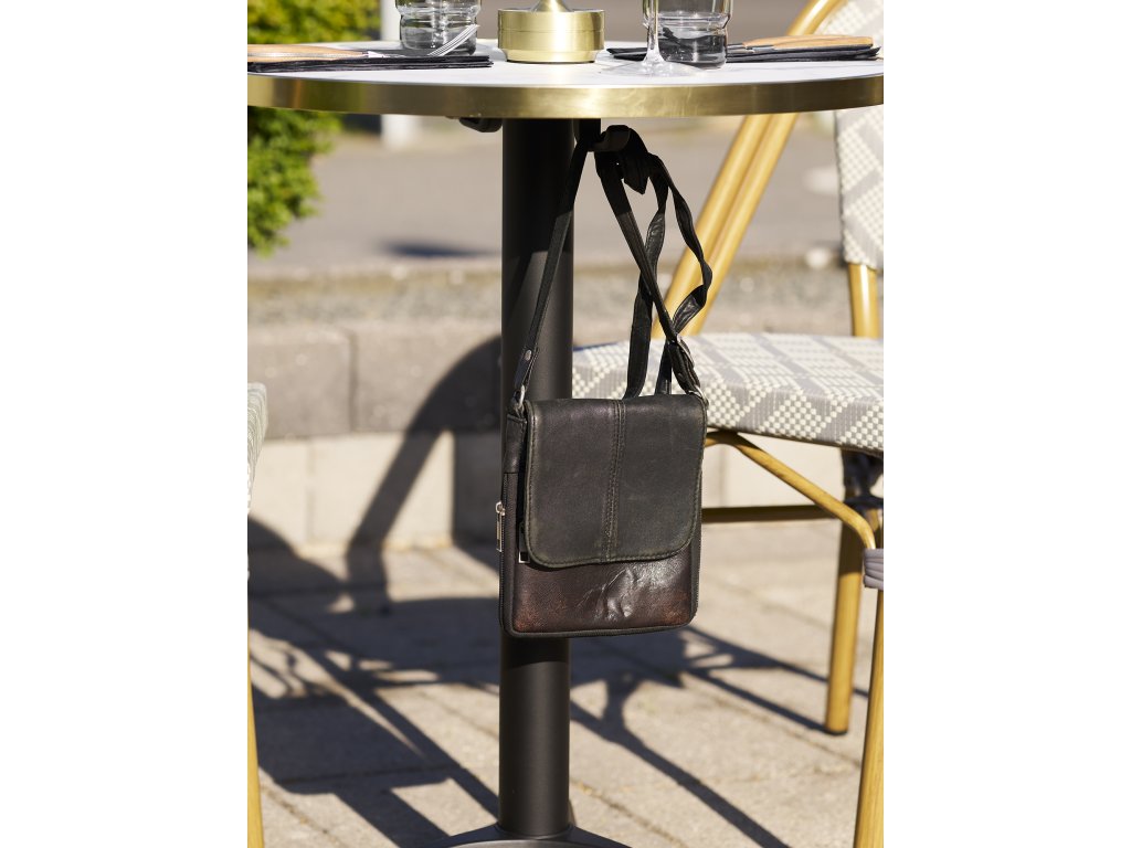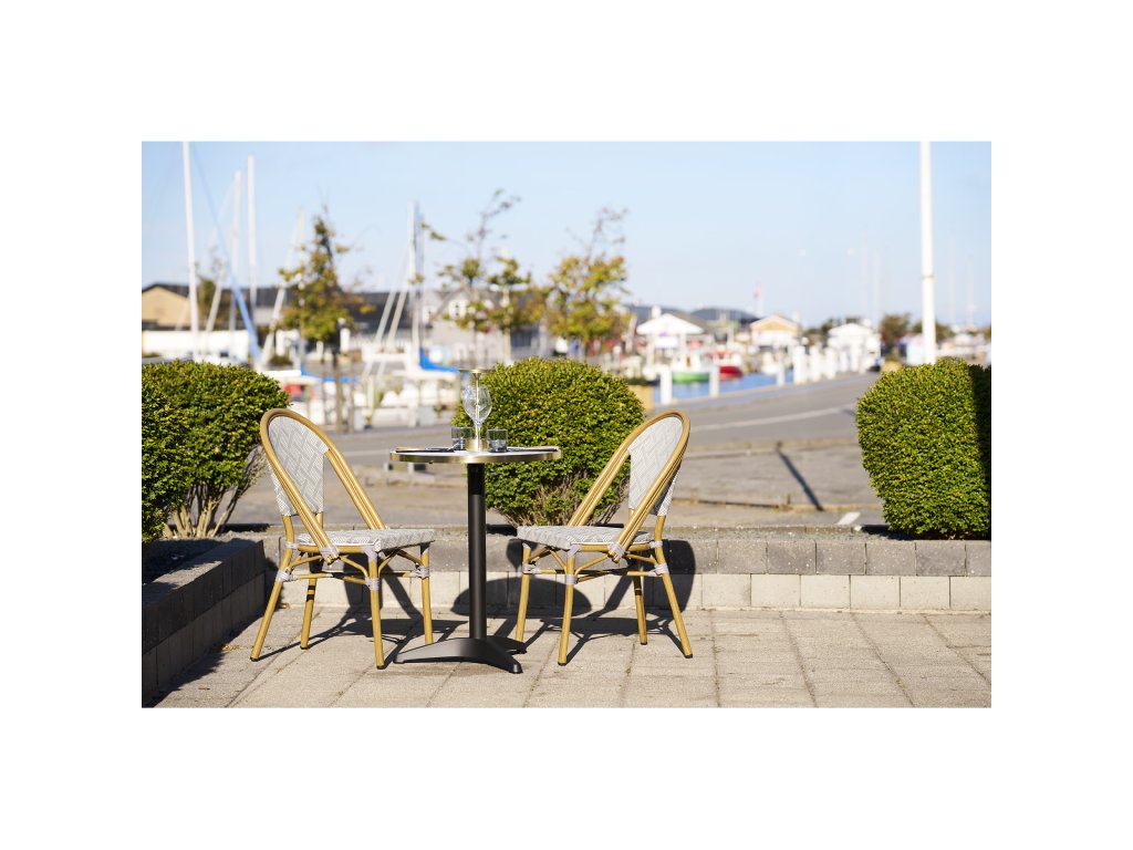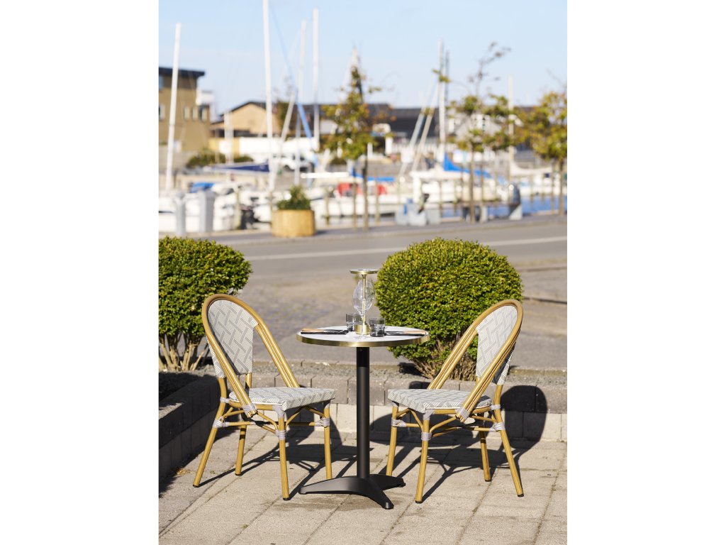 Kompaktný a štýlový, ideálny pre malé priestory, balkóny alebo kaviarne. Odolná konštrukcia, ľahká údržba a moderný mramorový vzhľad so zlatým okrajom dodávajú interiéru eleganciu a praktickosť.