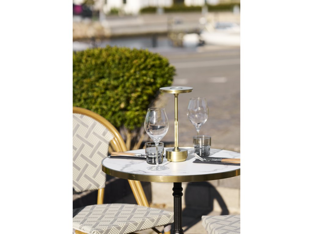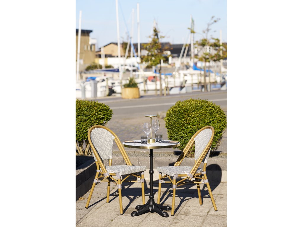 Kompaktný a štýlový, ideálny pre malé priestory, balkóny alebo kaviarne. Odolná konštrukcia, ľahká údržba a moderný mramorový vzhľad so zlatým lemom dodávajú interiéru eleganciu a praktickosť.