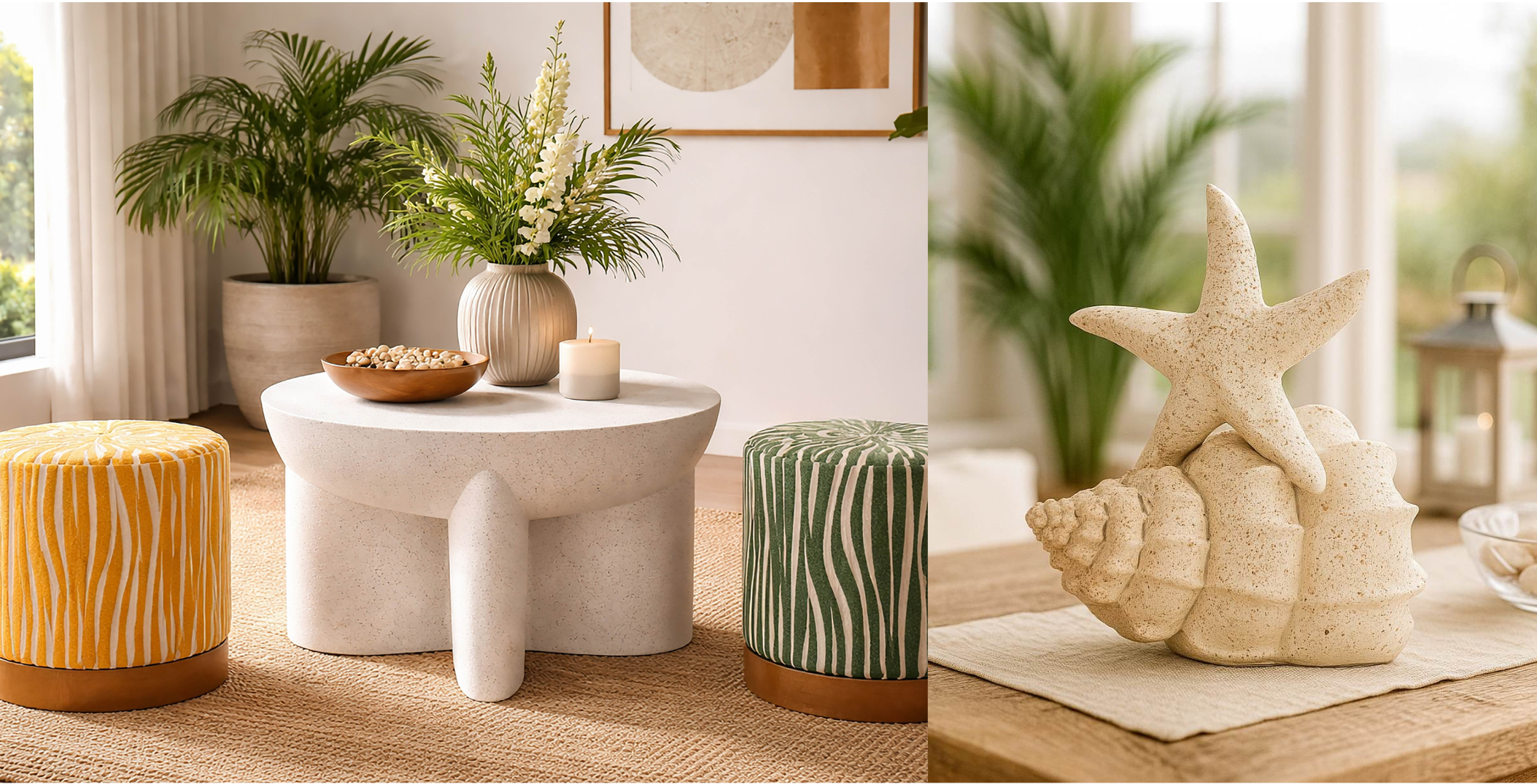 Tvary sú odvážne a fantazijné: stôl alebo zrkadlo v tvare obláčika, konferenčný stolík v tvare hviezdy, detské kreslá v tvare zajačika či sloníka. Objavujú sa aj zebrované vzory – na taburetkách, pohovkách či doplnkoch ako lampy alebo vázy – ktoré dodávajú interiéru hravosť a vizuálnu iskru. V trende sú aj rôzne doplnky v tlmených farbách, ale za to v neprehliadnuteľných tvaroch a vzoroch ako soška alebo váza v tvare rybičky, mušle, koralu či starovekých bohov.