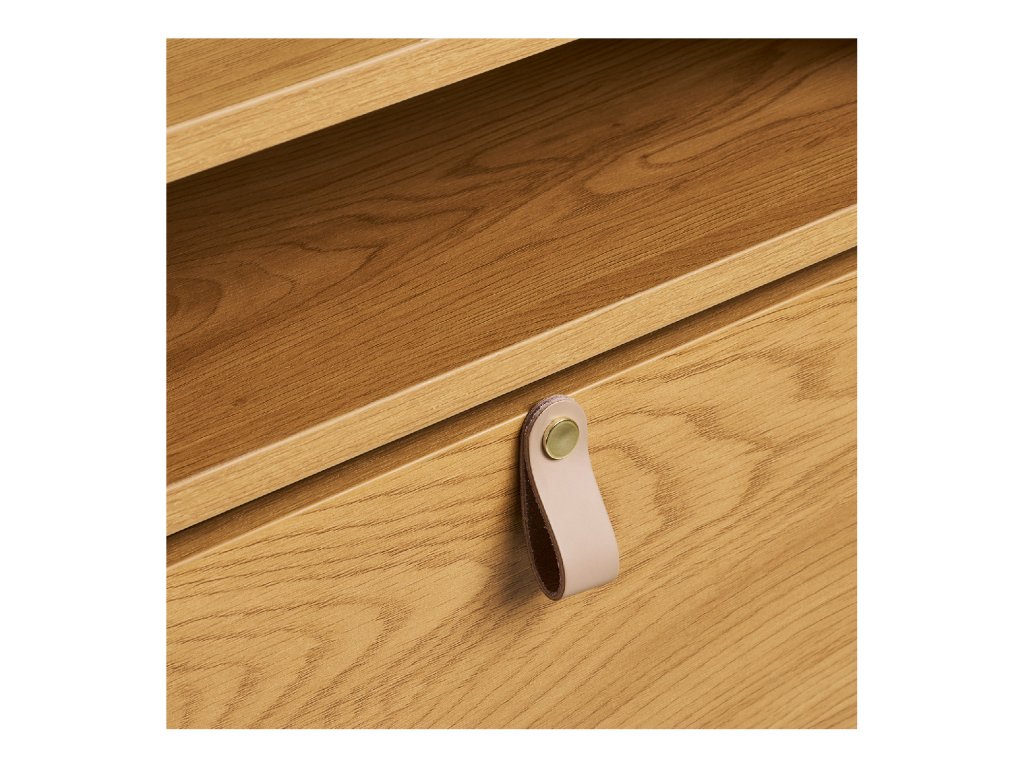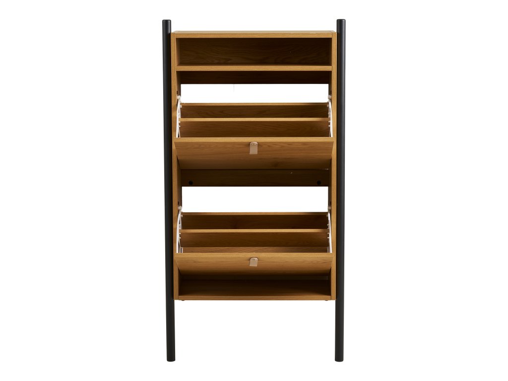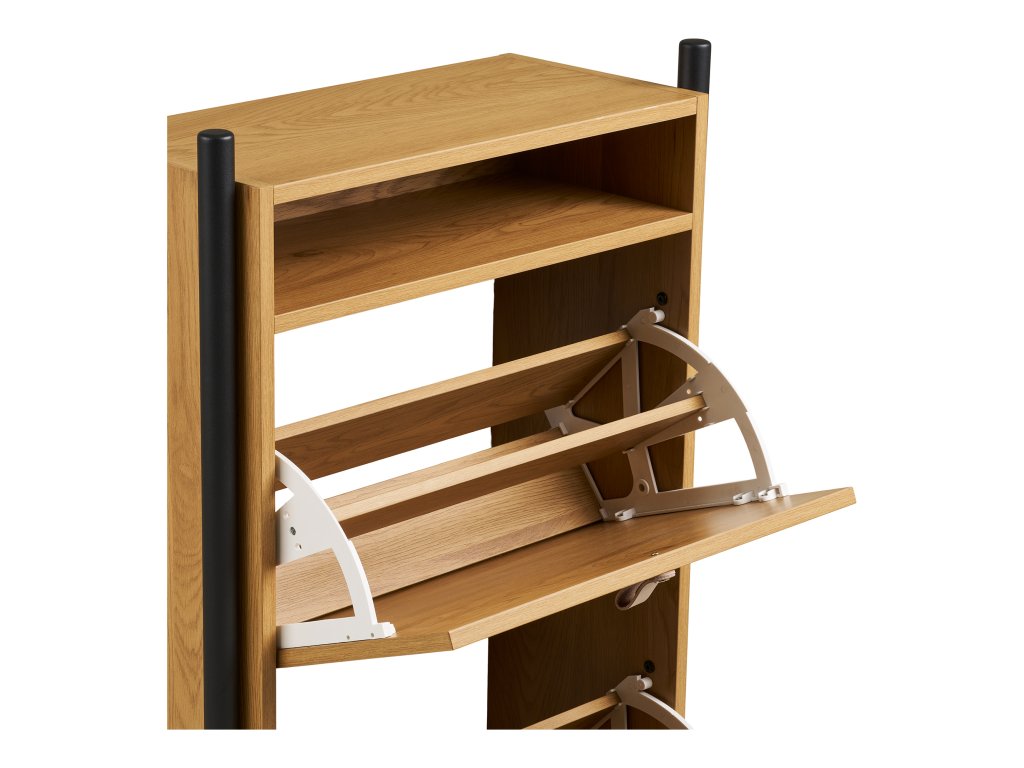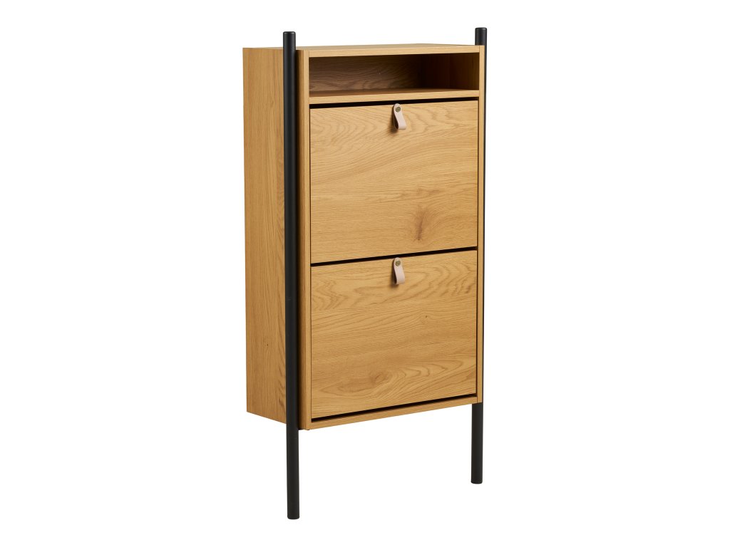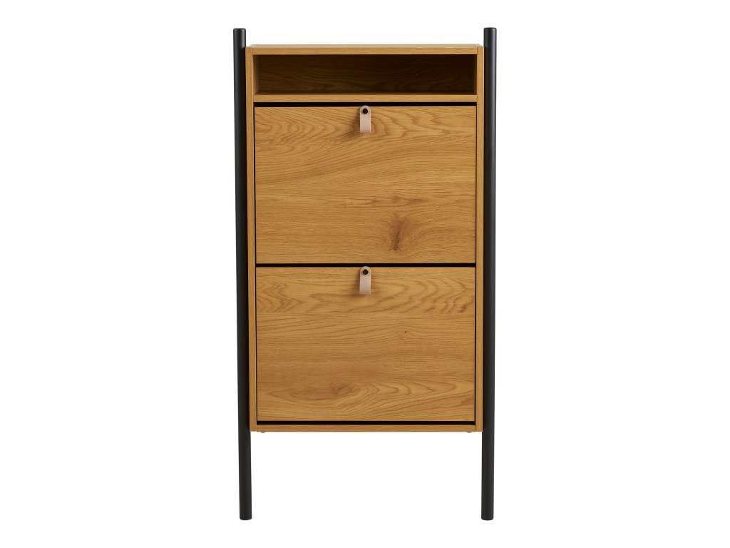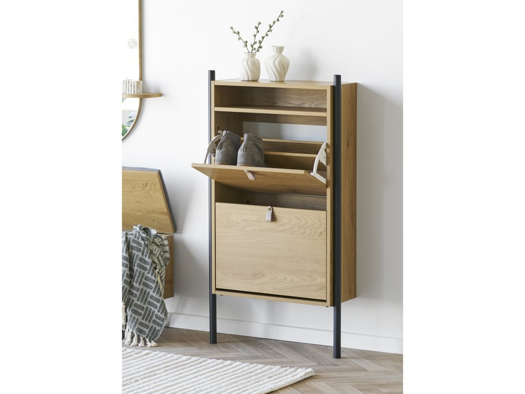 Botník je vyrobený z ocele a drevotriesky potiahnutej melamínovou fóliou, čo zaručuje vysokú odolnosť proti vlhkosti a mechanickému poškodeniu. Povrch v prírodnom dubovom odtieni pôsobí prirodzene a ľahko sa kombinuje s iným nábytkom.