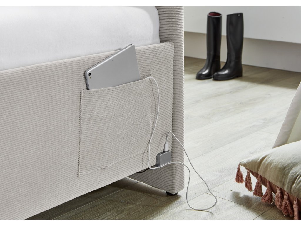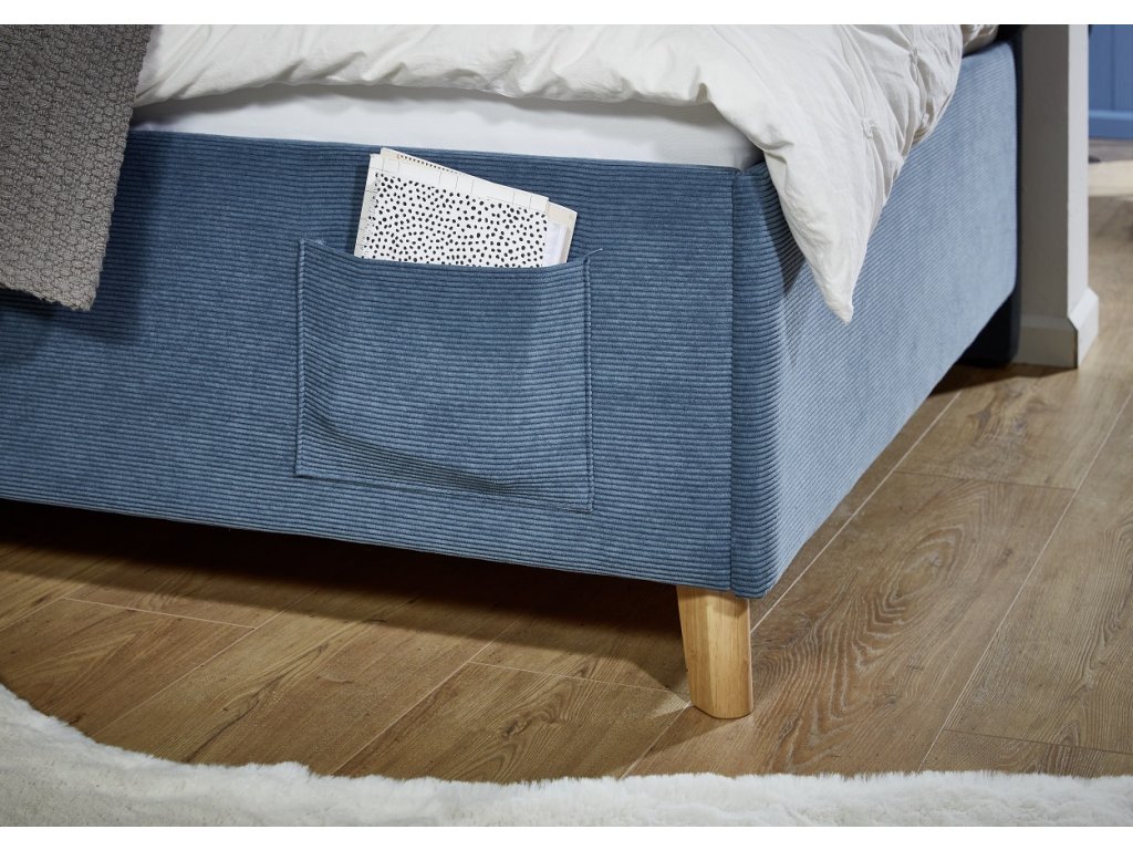 Posteľ je čalúnená látkou SCALA (Cord) z 100% polyesteru, ktorá je odolná, príjemná na dotyk a ľahko sa udržiava. Hladký čelný panel a zadná časť pôsobia elegantne a dodávajú posteli nadčasový vzhľad. Masívne nohy z prírodného dubu poskytujú stabilitu a zároveň decentne zvýrazňujú moderný dizajn.