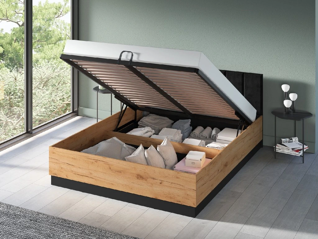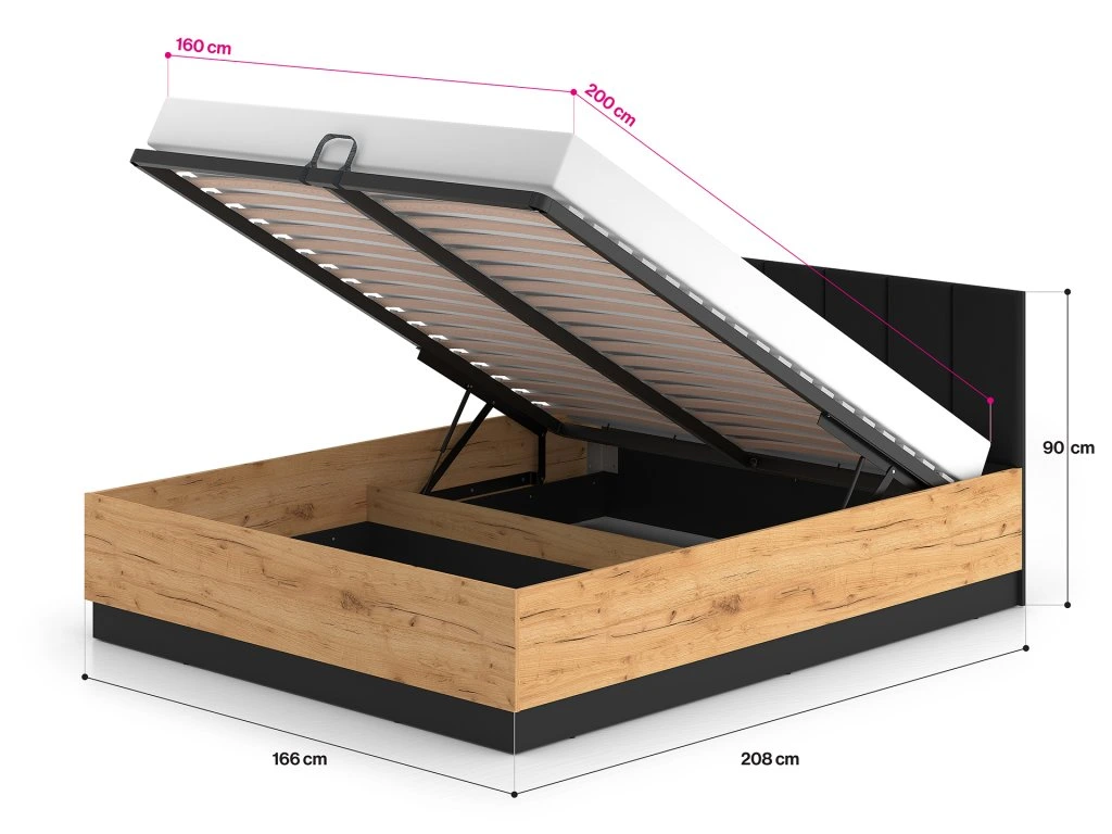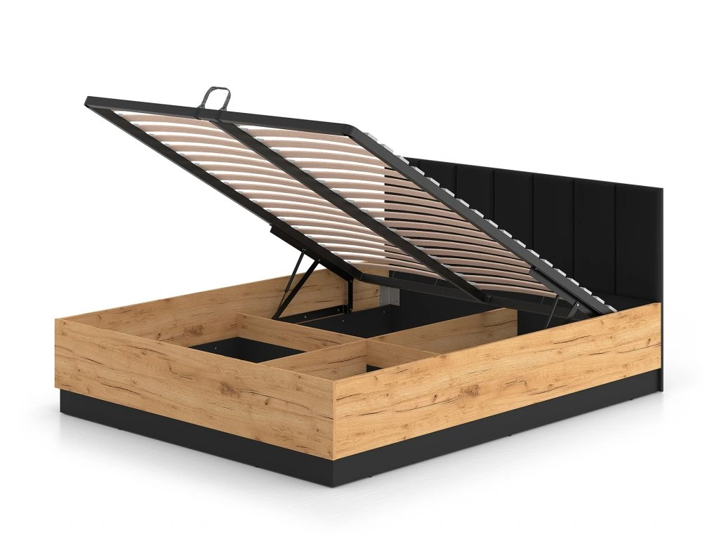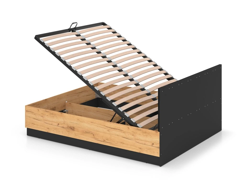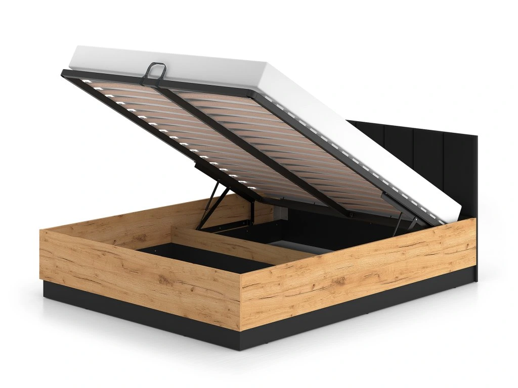 Posteľ je vybavená pevným kovovým roštom, ktorý zabezpečuje spoľahlivú oporu pre matrac a dlhú životnosť. Praktickým riešením je výklopný mechanizmus s plynovými piestami, vďaka ktorému jednoducho zdvihnete rošt aj s matracom a získate prístup k priestrannému úložnému priestoru. Matrac nie je súčasťou balenia.