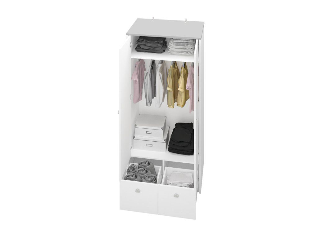 Vnútorný priestor skrine je navrhnutý pre prehľadné usporiadanie detského oblečenia. Umožňuje kombinovať zavesené aj zložené veci, čím zabezpečuje praktické každodenné používanie a jednoduchý prístup.