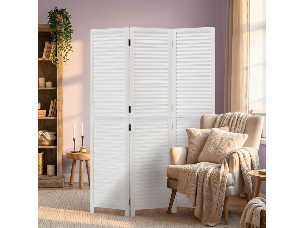 3-dielny paraván s bielymi drevenými lištami