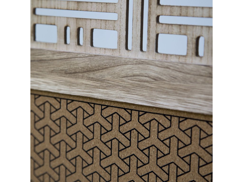 Hornú časť dopĺňajú vyrezávané ornamenty, ktoré mu prepožičiavajú jemný nádych tradičného remesla. Každý detail tohto paravánu pôsobí premyslene – od precízne frézovaných vzorov až po harmonickú kombináciu hnedých a prírodných tónov.