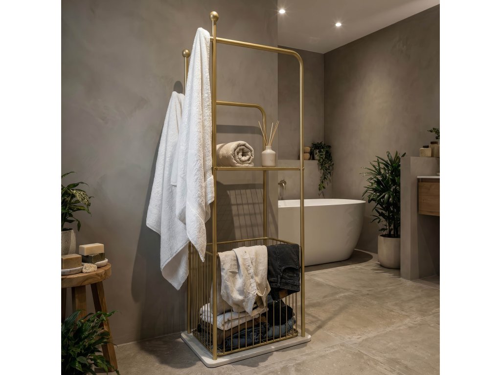 Držiak na uteráky Mauro Ferretti Flish je moderný a štýlový doplnok do kúpeľne, ktorý spája funkčnosť s elegantným dizajnom. Jeho harmonická kovová konštrukcia v zlatom prevedení pôsobí ľahko a dekoratívne, pričom zároveň poskytuje praktické riešenie na odkladanie a sušenie uterákov.