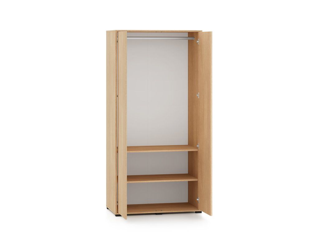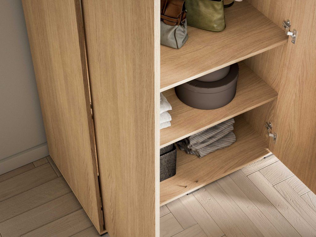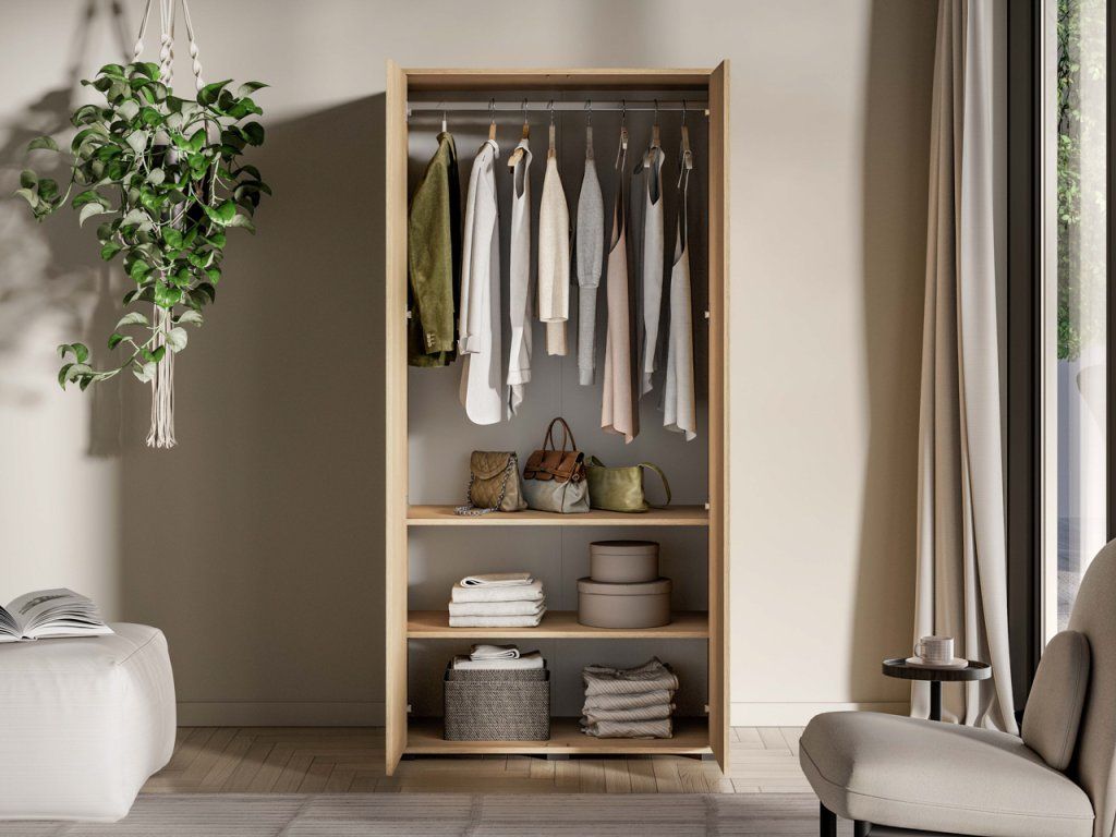 Vnútorný priestor skrine je navrhnutý s dôrazom na maximálnu funkčnosť. Vešiaková tyč umožňuje pohodlné zavesenie košieľ, šiat či kabátov bez pokrčenia. Spodnú časť tvoria dve široké úložné zóny, ktoré sú ideálne na obuv, krabice s doplnkami alebo poskladané textílie.