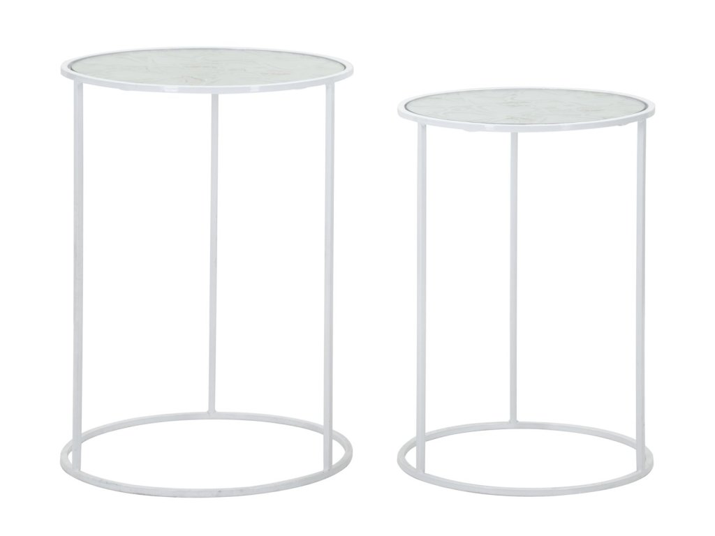 Luxusná sada dvoch stolíkov White Harts spája čistý moderný dizajn, praktickosť a nadčasový štýl v jednom elegantnom kúsku. Stolíky majú okrúhly tvar, bielu kovovú konštrukciu a sklenenú dosku s jemným dekoratívnym motívom, ktorý dodáva priestoru sofistikovaný a vzdušný vzhľad. Stolíky sú ideálne ako bočné stolíky, odkladacie plochy pre dekorácie alebo ako dizajnový prvok, ktorý ozvláštni obývačku, predsieň, spálňu či kanceláriu.