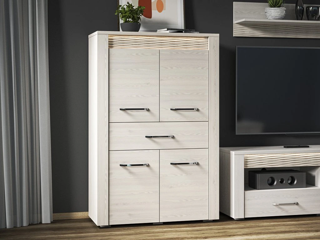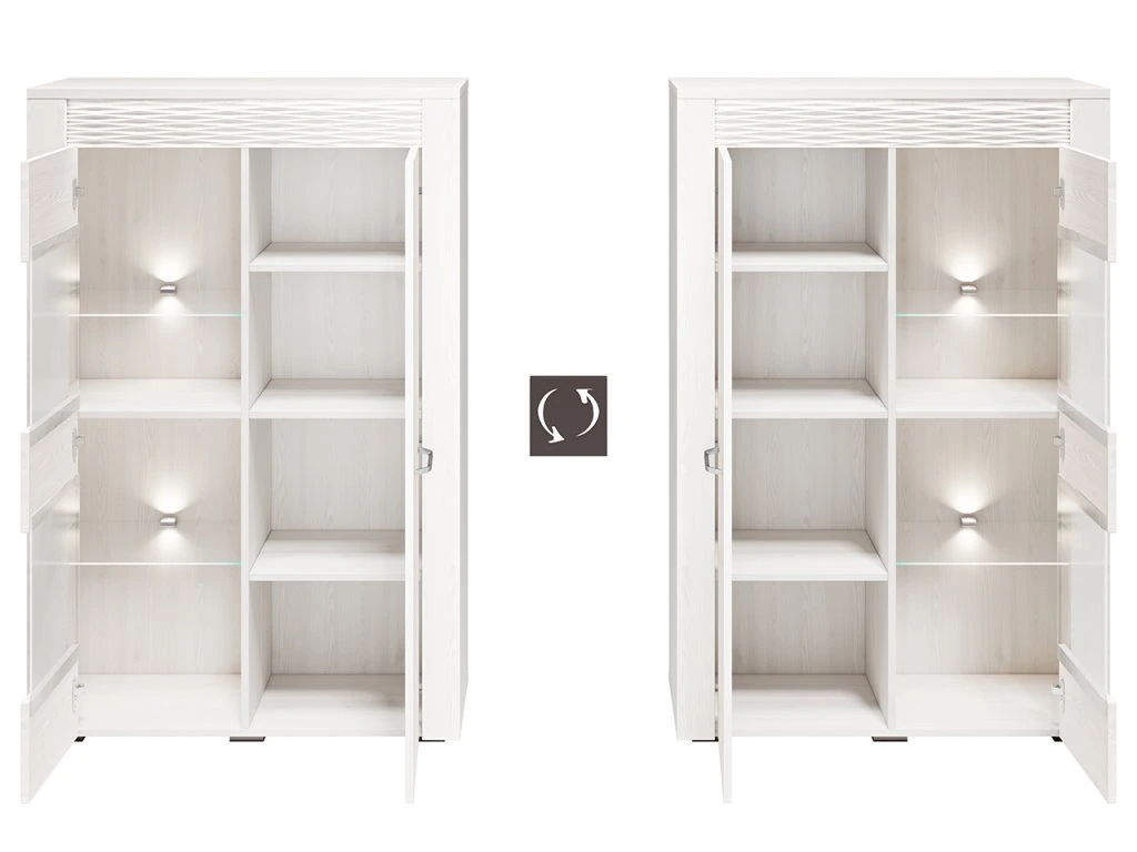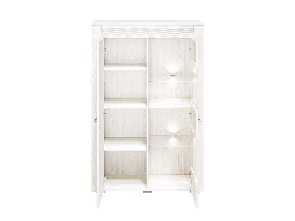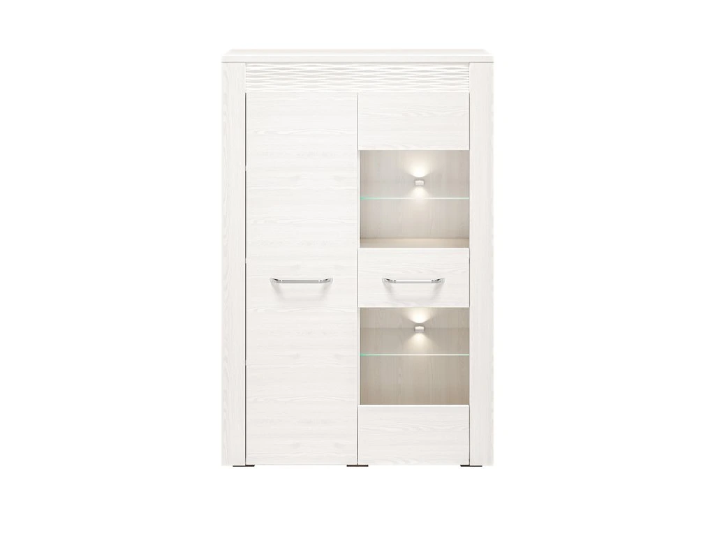 Vitrína – moderná vitrína v dekore sosna snehová s MDF prvkami