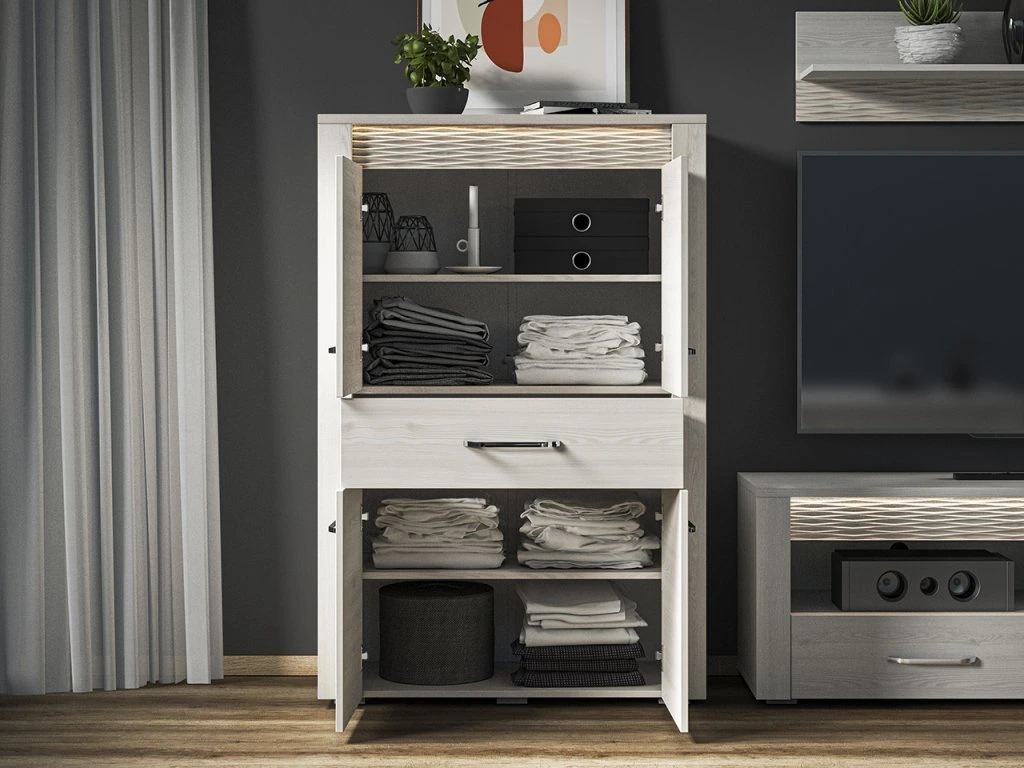 Vitrína v dekore sosna snehová je elegantný a praktický kus nábytku, ktorý umožňuje štýlovo vystaviť vaše obľúbené predmety a zároveň ponúka dostatok úložného priestoru. Svetlé prevedenie v dekore dreva pôsobí jemne a vzdušne, vďaka čomu sa vitrína hodí do moderných aj škandinávskych interiérov.
