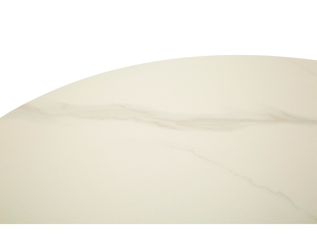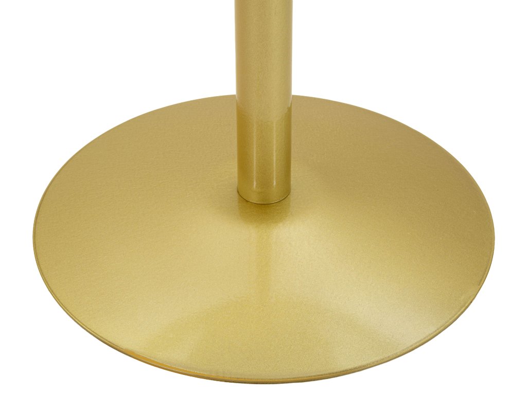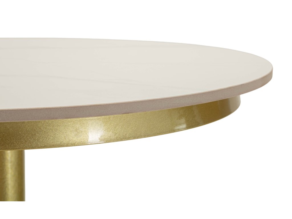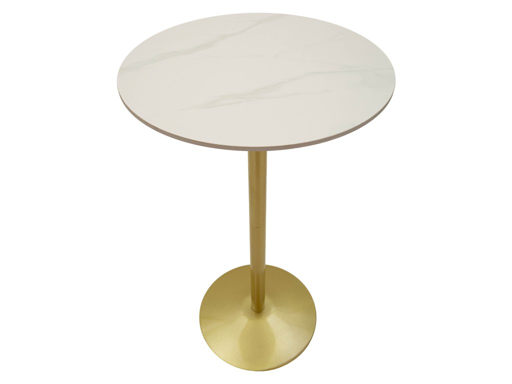 Dominantným prvkom stola je stolová doska s mramorovým efektom v bielom odtieni, ktorá dodáva nábytku elegantný a nadčasový vzhľad. Doska je doplnená zlatou kovovou základňou, ktorá vytvára harmonický kontrast a zároveň zabezpečuje stabilitu celej konštrukcie.