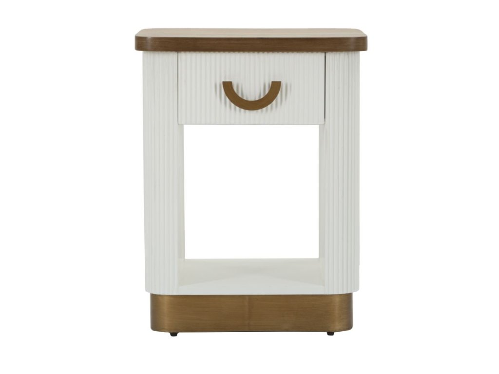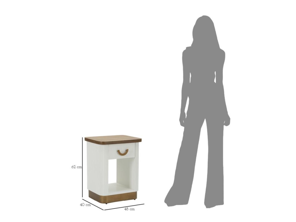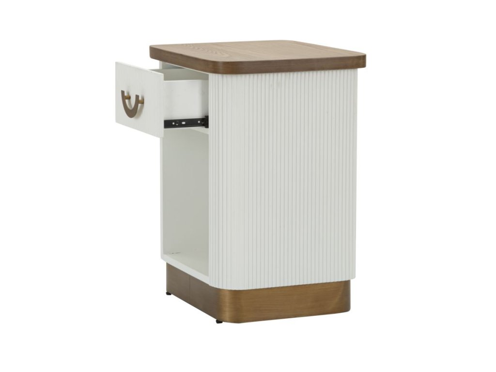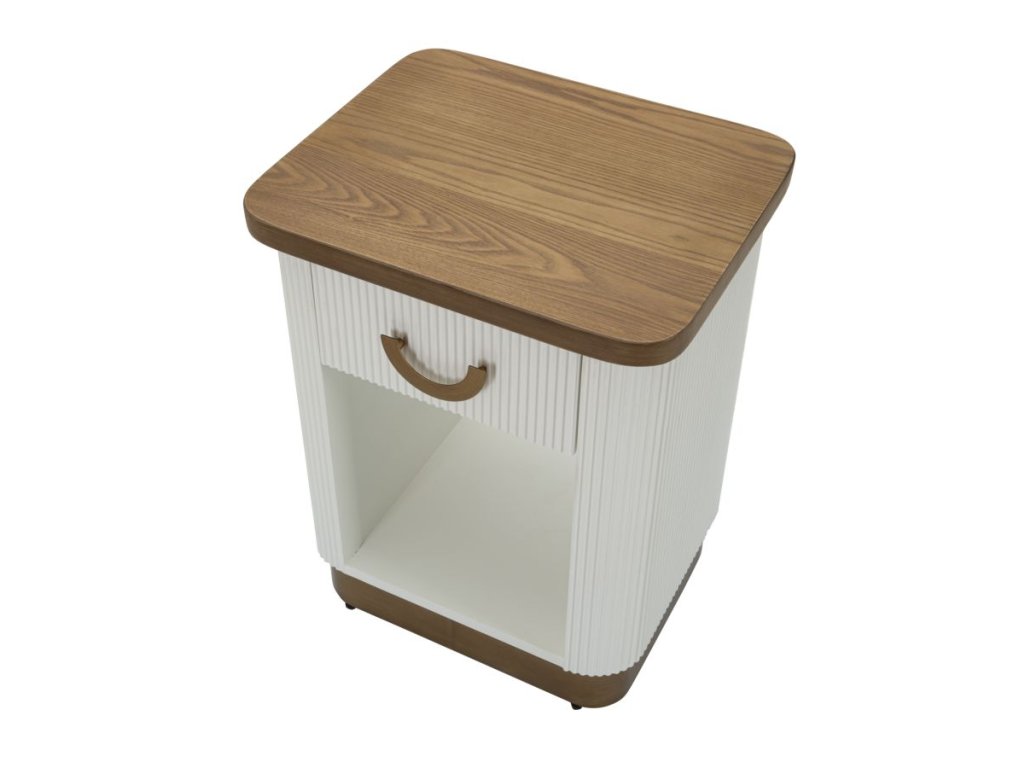 Nočný stolík TOLOSA je spojením moderného dizajnu a praktickej funkčnosti. V bielom prevedení s jemným ryhovaným povrchom a detailmi v prírodnom dekore dreva pôsobí elegantne a nadčasovo.