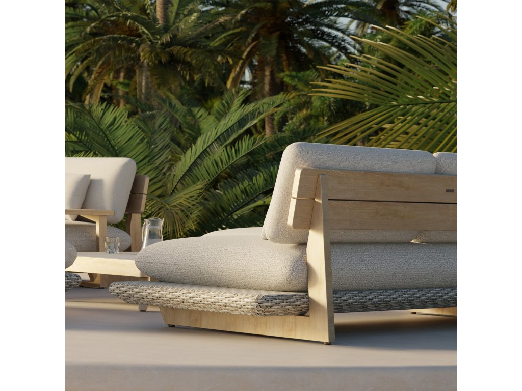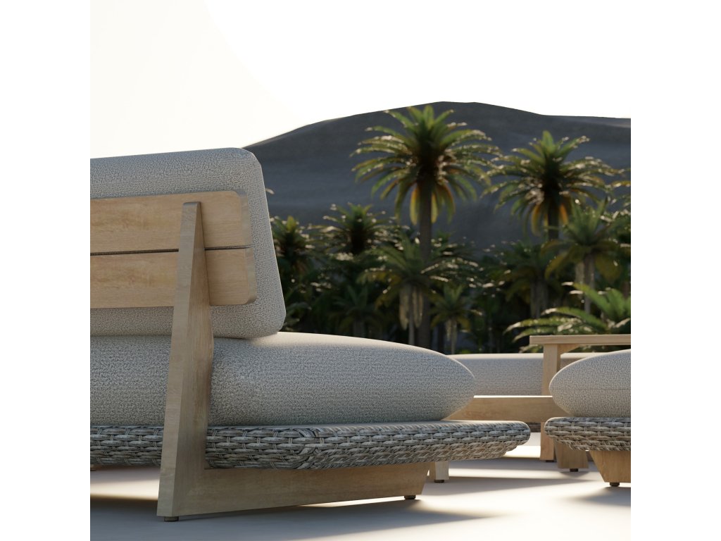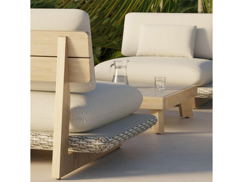 Konštrukcia sedacej súpravy je vyrobená z hliníka so štruktúrou a povrchom imitujúcim drevo, čo zaručuje odolnosť proti korózii a poveternostným vplyvom, pričom si zachováva prírodný, teplý vzhľad. Sedacie časti sú opletené syntetickým ratanom v bledošedej farbe, ktorá ladí s dubovo tónovanými prvkami a dodáva celej súprave moderný a elegantný vzhľad.