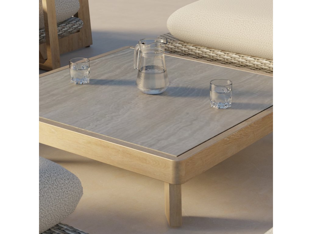 Stolová doska je vyrobená z sinterovaného kameňa, ktorý je odolný voči poškriabaniu, UV žiareniu aj poveternostným zmenám, a pôsobí prémiovo. Bočný stolík k dennému kreslu pridáva praktický priestor na odloženie nápojov či dekorácií.