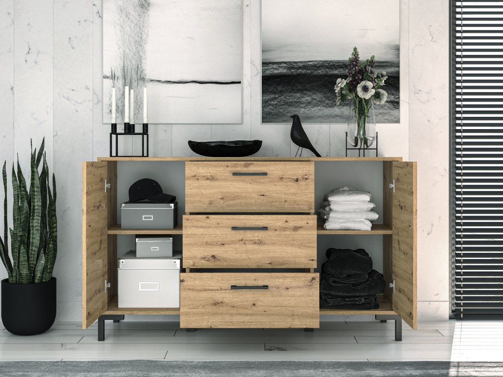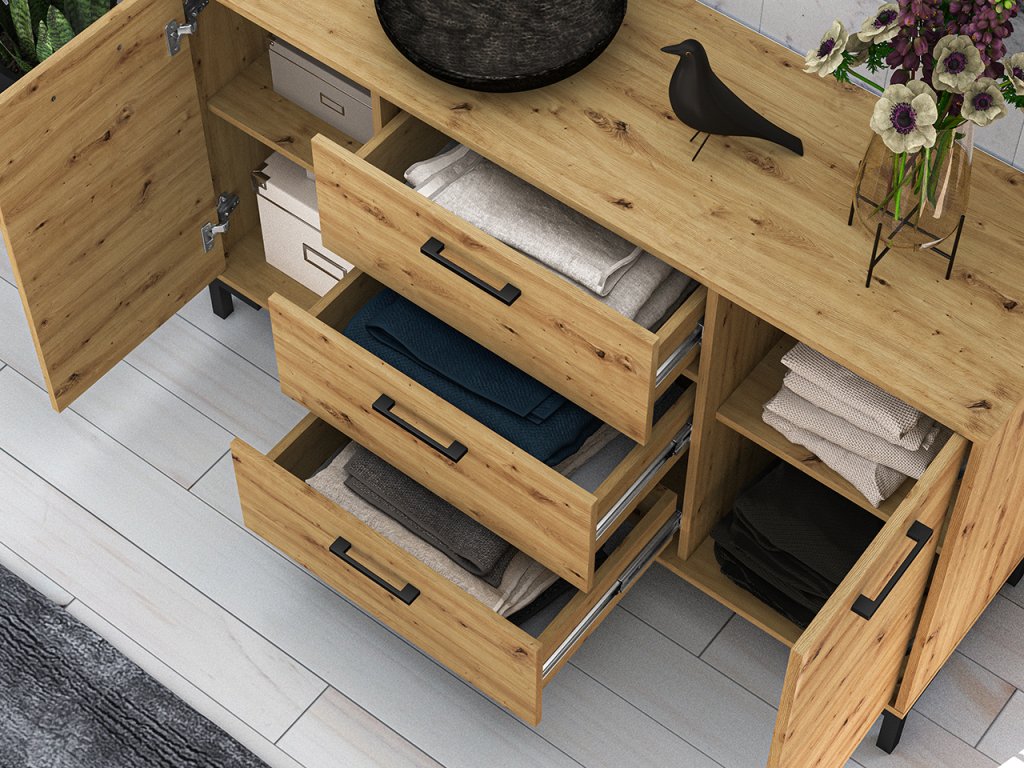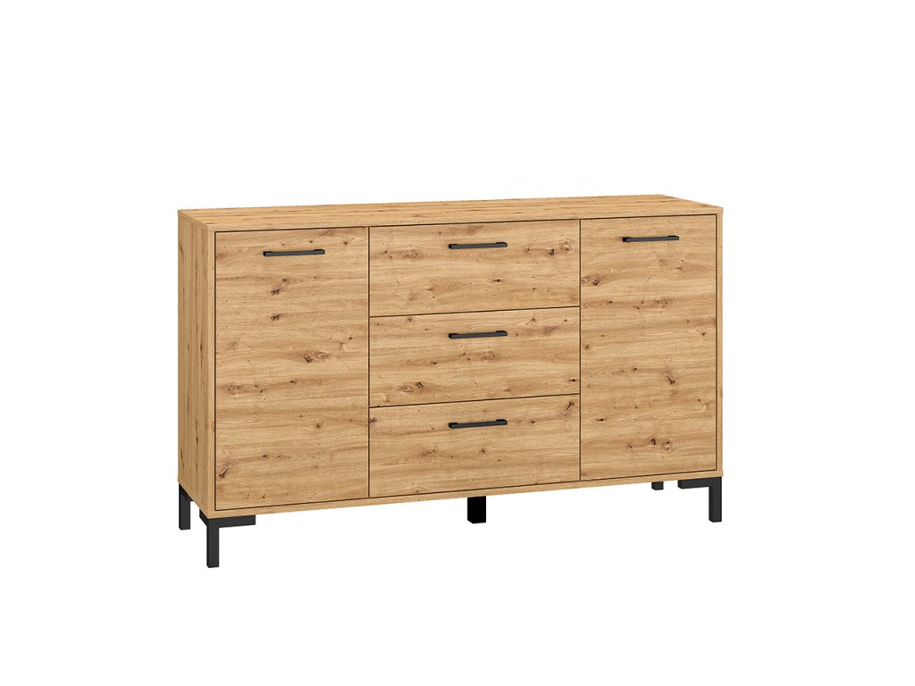 Komoda z kolekcie Nevio spája moderný dizajn s funkčnosťou, ktorá zabezpečí prehľadné usporiadanie vecí v domácnosti. Elegantný dekor Dąb Artisan dodáva nábytku prírodný a nadčasový vzhľad, ktorý ľahko zapadne do rôznych interiérov.