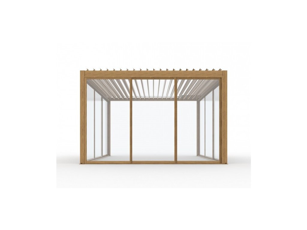 Pergolu možno uzavrieť pomocou žalúziových panelov alebo markíz. Takto si vytvoríte priestor, ktorý vám umožní relaxovať bez ohľadu na počasie. Obklad stien je možné ľubovoľne konfigurovať a vytvoriť tak priestor, ktorý bude optimálne vyhovovať vašim potrebám. Výhodou pergoly je strecha vybavená pohodlným systémom manuálneho otvárania, ktorý umožňuje prispôsobiť zatienenie individuálnym očakávaniam.