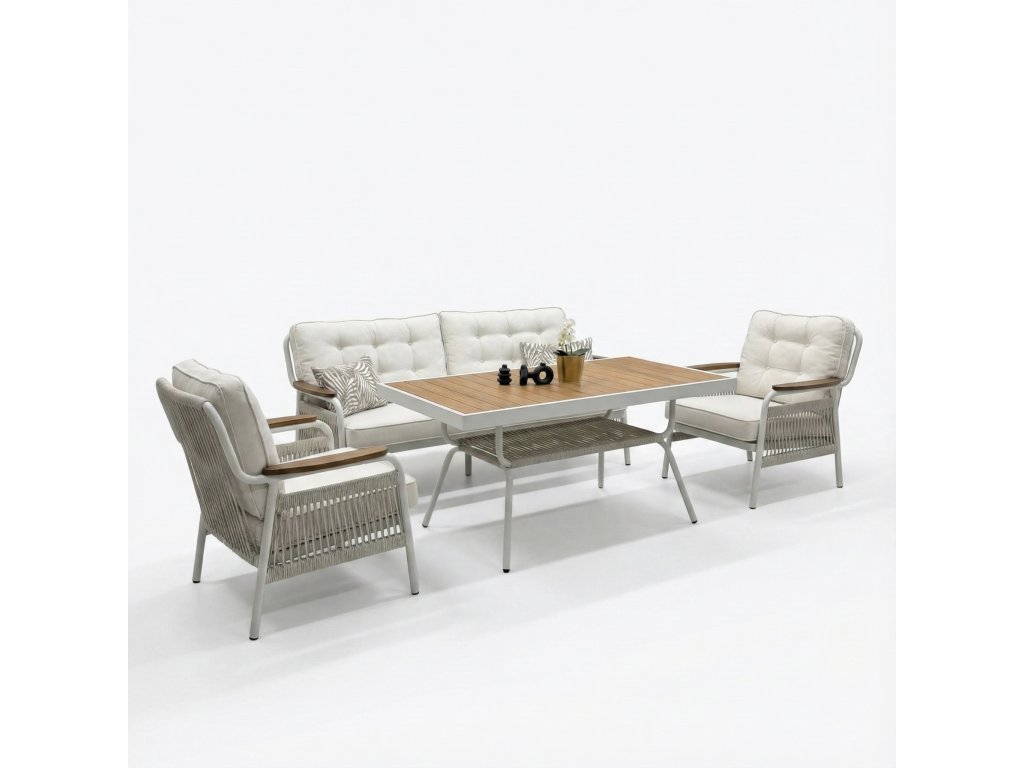 Hlavnou prednosťou súpravy Halley sú nové trendy lanové výplety, ktoré sú príjemné na dotyk, odolné voči poveternostným vplyvom a UV žiareniu a pridávajú luxusný, no zároveň prirodzený vzhľad. Spojenie hliníka a lanového výpletu zabezpečuje stabilitu, pevnosť a ľahkú údržbu, čo robí súpravu ideálnou pre každodenné používanie vonku.