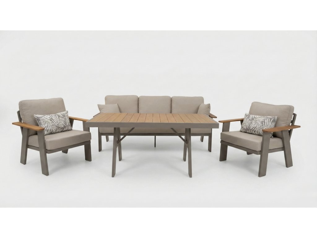 Záhradná súprava Nova prináša elegantné a praktické riešenie pre vašu terasu alebo záhradu. Je dostupná v dvoch nadčasových prevedeniach: hnedý hliník alebo antracitový hliník, takže si ľahko vyberiete farebný odtieň, ktorý dokonale zapadne do vášho exteriéru. Súprava Nova sa skladá z trojpohovky, dvoch kresiel a jedálenského stola, čím poskytuje dostatok priestoru pre pohodlné stolovanie a relax.