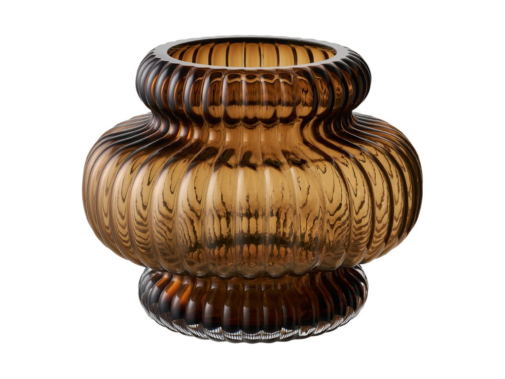 Dekoratívna váza z ručne fúkaného skla v elegantnom odtieni smoked brown. Jemný dymový efekt v kombinácii s nižším, širším tvarom vytvára moderný a zároveň nadčasový vzhľad, ktorý sa hodí do obývačky, jedálne aj spálne.