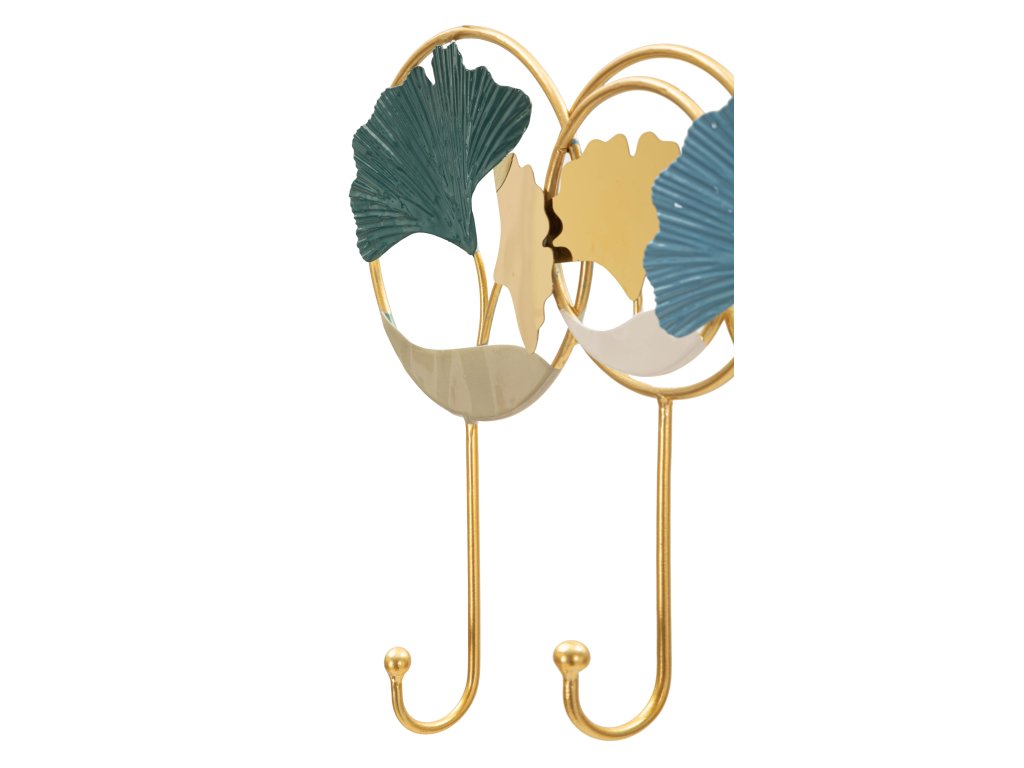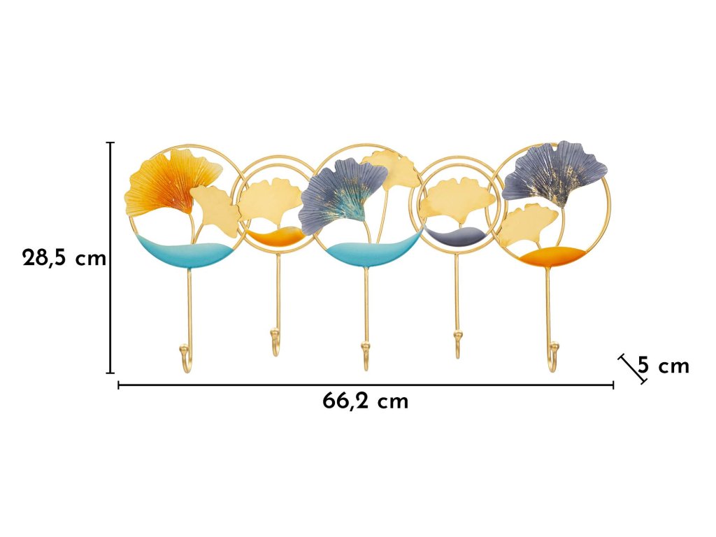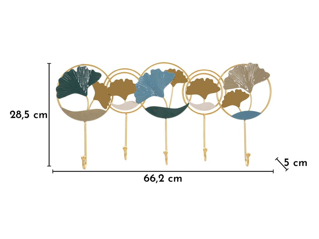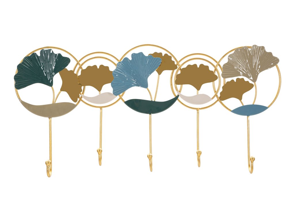 Konštrukcia vešiaka je vyrobená z kovu so zlatou povrchovou úpravou, ktorá dodáva celému dizajnu elegantný a luxusný vzhľad. Dekoratívne prvky vytvárajú zaujímavú kompozíciu, ktorá dodáva stene dynamiku a osobitý charakter.