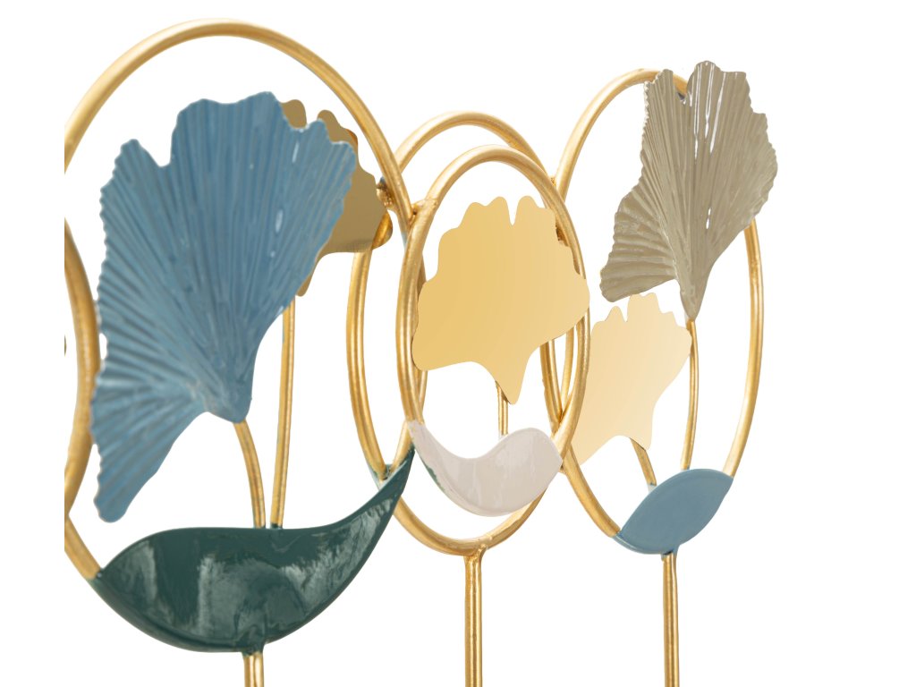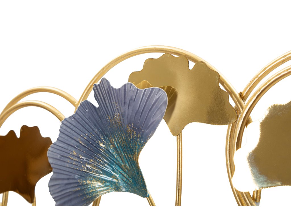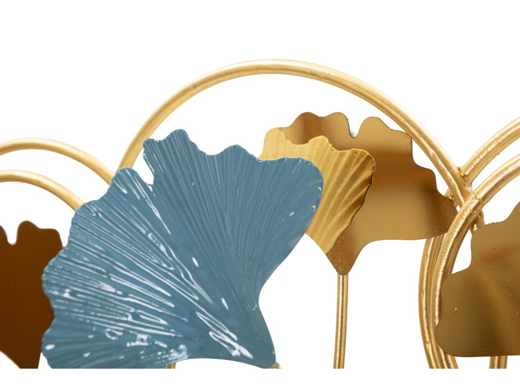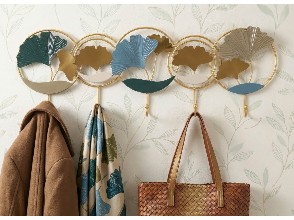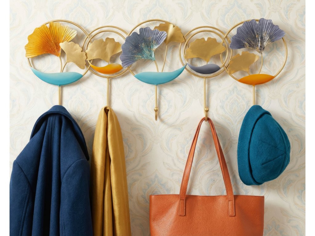 Konštrukcia vešiaka je vyrobená z kovu so zlatou povrchovou úpravou, ktorá dodáva celému dizajnu elegantný a luxusný vzhľad. Dekoratívne prvky vytvárajú zaujímavú kompozíciu, ktorá dodáva stene dynamiku a osobitý charakter.