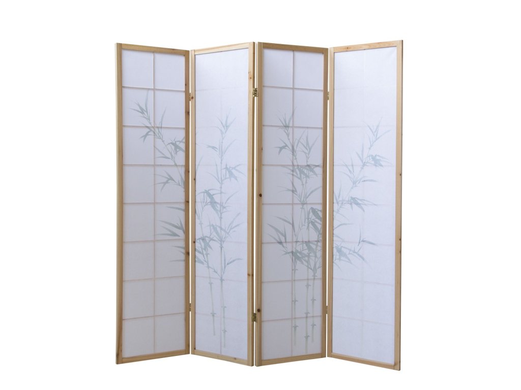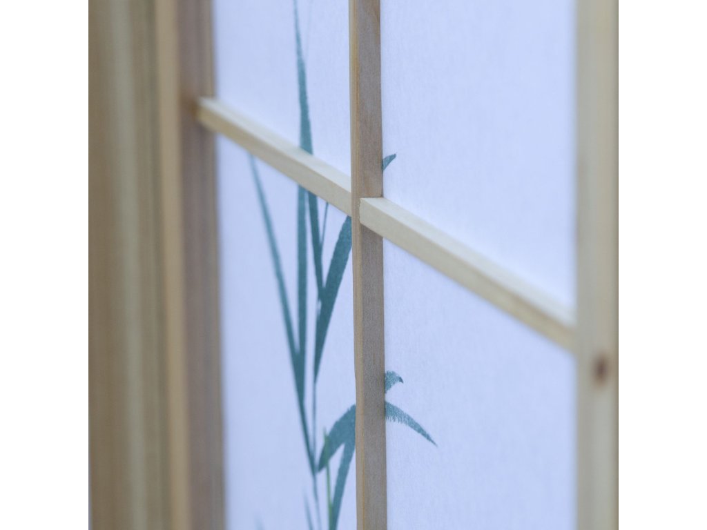 Štvordielny paraván s motívom bambusových výhonkov. Bledý drevený rám v prírodnom odtieni a výplň z ryžového papiera.
