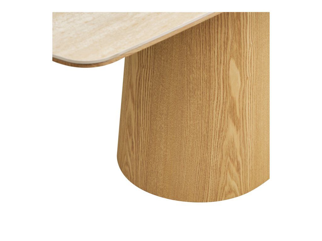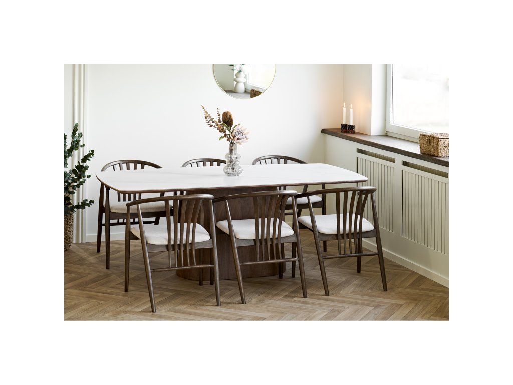 Vrchná doska z keramiky je mimoriadne odolná voči poškriabaniu, teplu aj každodennému používaniu, čo z nej robí ideálnu voľbu pre rodinné stolovanie. Stabilná konštrukcia z MDF s jaseňovou dyhou a pevným dreveným rámom zabezpečuje dlhú životnosť a spoľahlivosť.