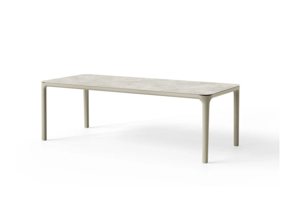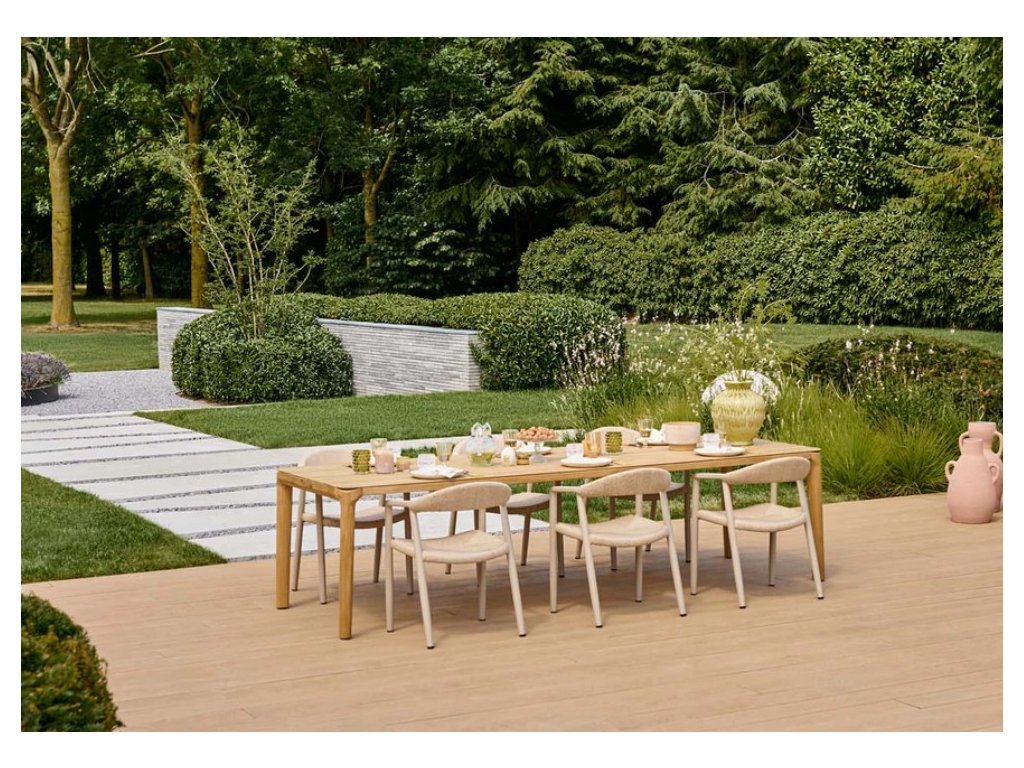 Jedálenský stôl SUNS Pemba predstavuje dominantný prvok kolekcie a ideálnu voľbu pre štýlové stolovanie na terase alebo v záhrade. Elegantný dizajn s jemne zaoblenými rohmi a štíhlym profilom dodáva stolu moderný a nadčasový vzhľad. Vďaka premyslenej konštrukcii sú nohy umiestnené úplne v rohoch stola, čo zabezpečuje maximálny priestor na nohy a pohodlné sedenie zo všetkých strán. Tento exteriérový jedálenský stôl je navrhnutý tak, aby spájal komfort, funkčnosť a luxusný vzhľad.