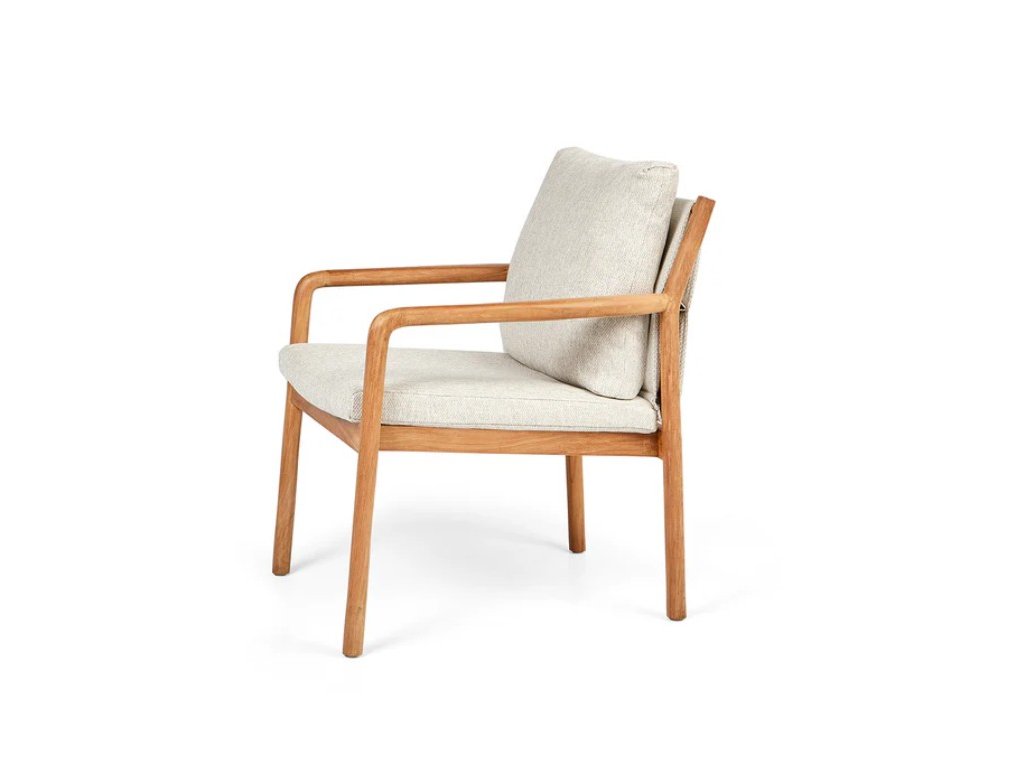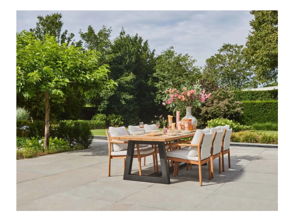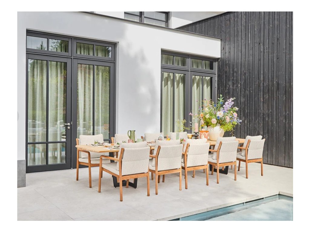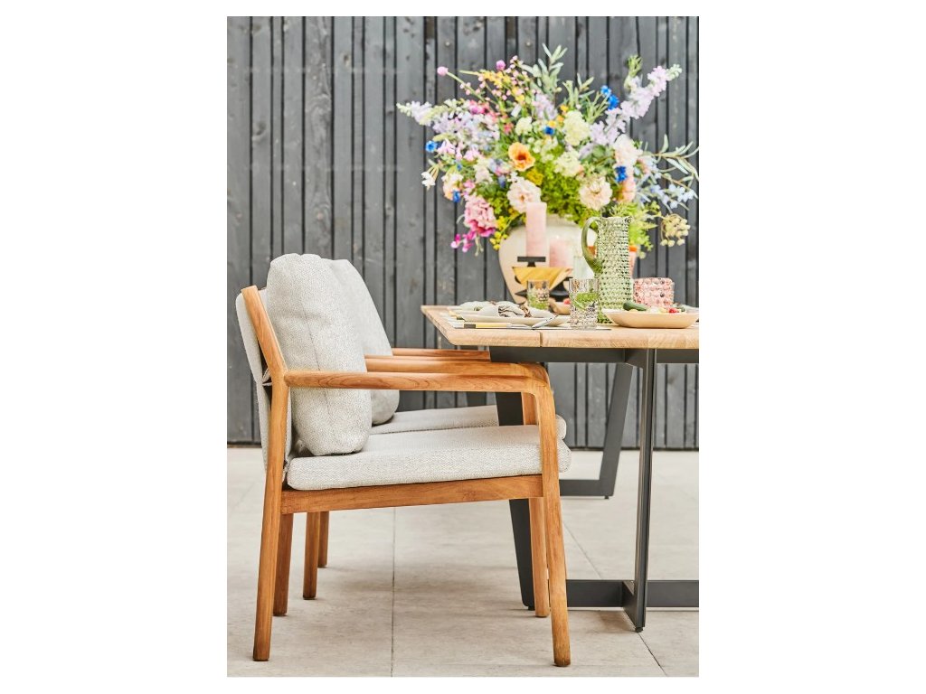Rám stoličky je vyrobený z kvalitného teakového dreva. Teak patrí medzi najodolnejšie dreviny používané na výrobu záhradného nábytku. Vyznačuje sa vysokou pevnosťou, prirodzenou odolnosťou voči vlhkosti a dlhoročnou životnosťou aj pri vonkajšom používaní.