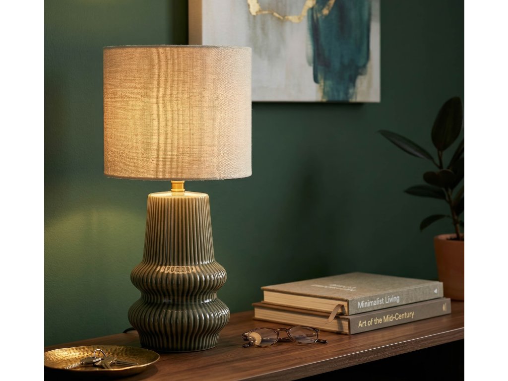 Keramická základňa lampy má vlnitý reliéfny povrch s matnou úpravou, ktorý dodáva lampe zaujímavú textúru a moderný charakter. Textilné cylindrické tienidlo v neutrálnej farbe jemne rozptyľuje svetlo a vytvára mäkké, príjemné osvetlenie vhodné na relax alebo večernú atmosféru.