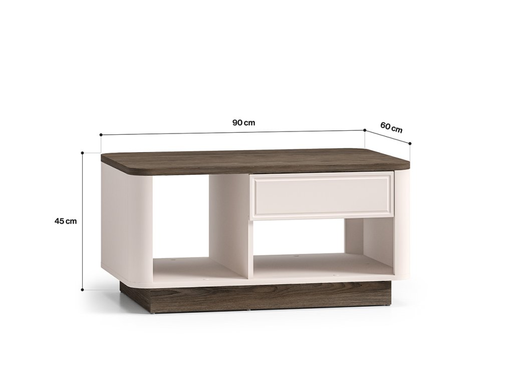Široká horná doska poskytuje dostatok priestoru na šálku kávy, knihy, časopisy alebo dekorácie. Pod doskou sa nachádzajú dve priestranné otvorené úložné časti, ideálne na uloženie kníh alebo magazínov.