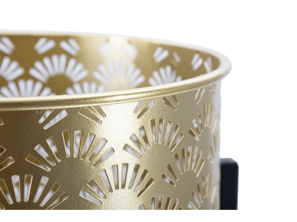 Predstavuje štýlový a luxusný doplnok vhodný do každého moderného interiéru. Zlaté nádoby zdobia jemné carvings vzory pripomínajúce listy, ktoré pôsobia elegantne a sofistikovane. V kombinácii s čiernym kovovým podstavcom vzniká harmonický a nadčasový vzhľad.