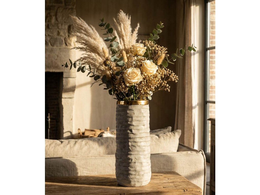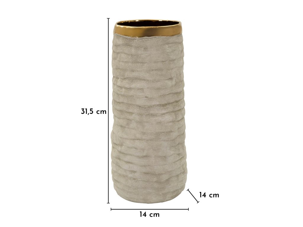 Menšia váza Lima od talianskej značky Mauro Ferretti prináša do interiéru jemnú eleganciu a nadčasový dizajn v kompaktnejšej forme. Jej harmonické proporcie, šedo-zlatá farebná kombinácia a čistý valcovitý tvar vytvárajú sofistikovaný doplnok, ktorý pôsobí moderne, no zároveň veľmi príjemne a prirodzene.