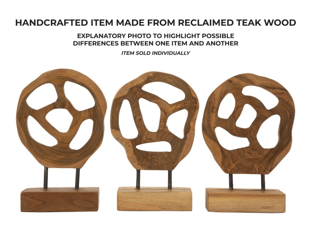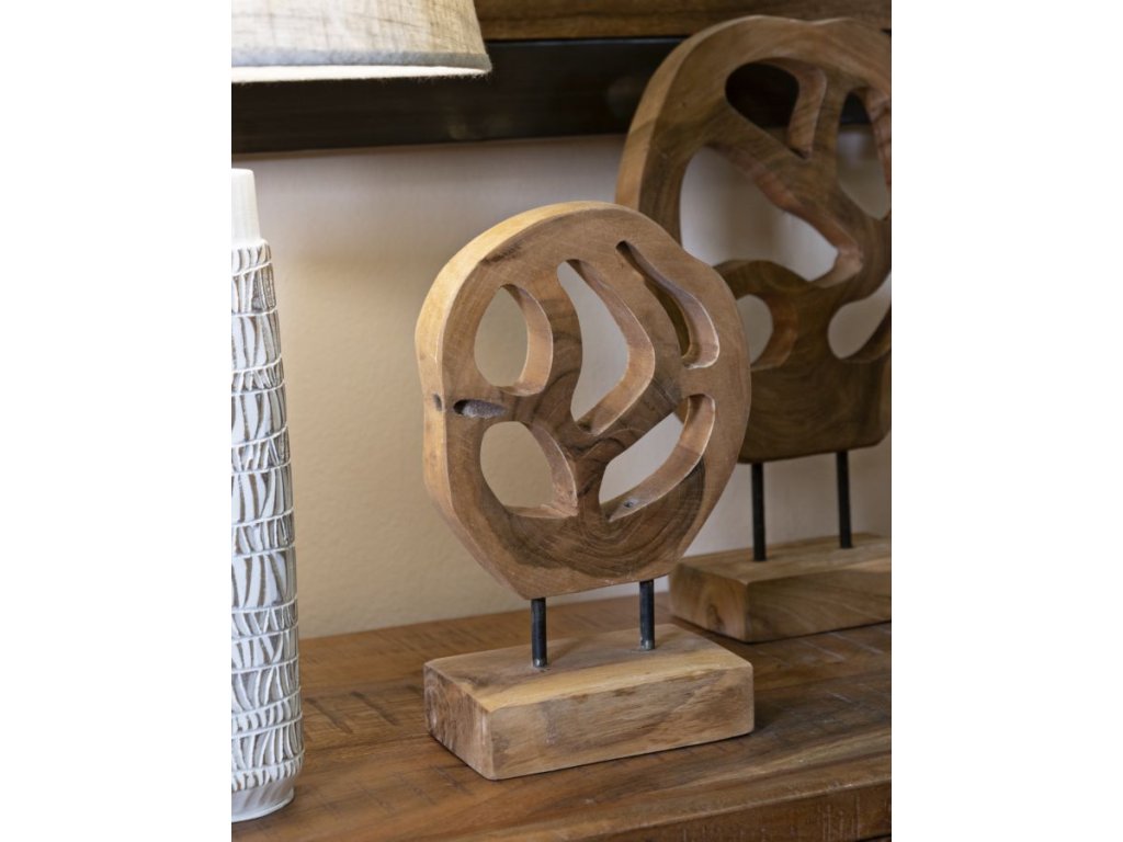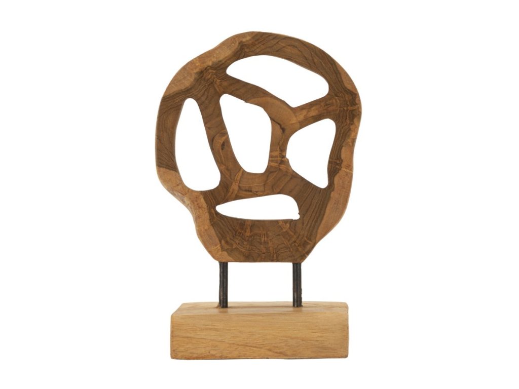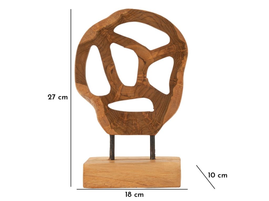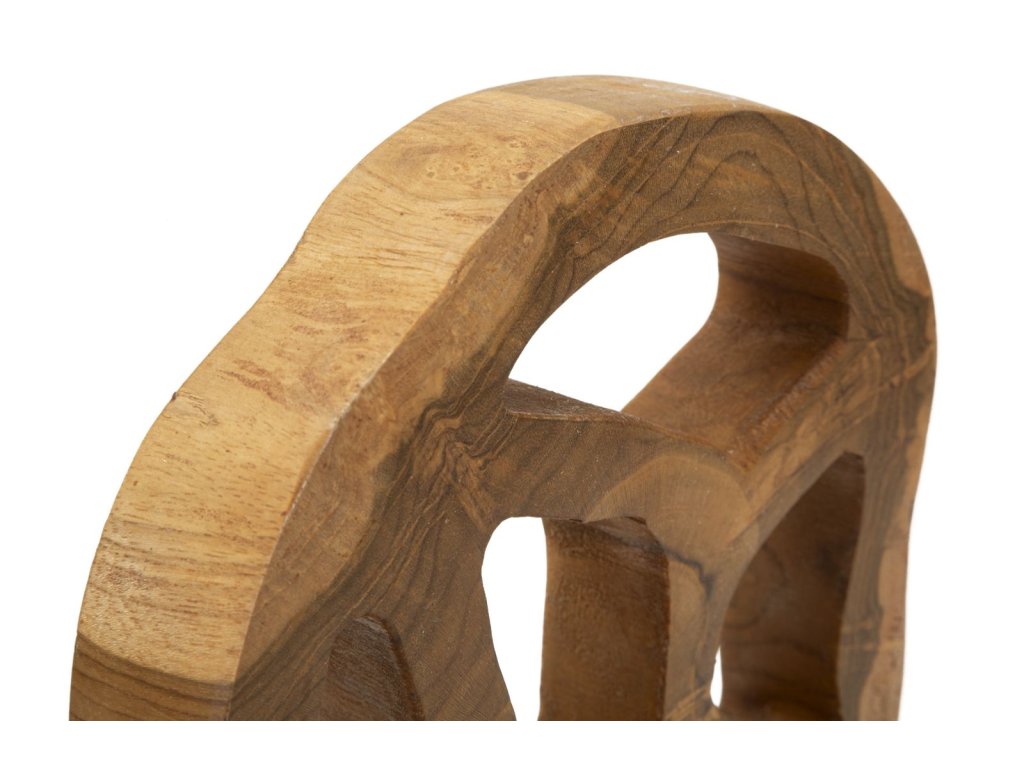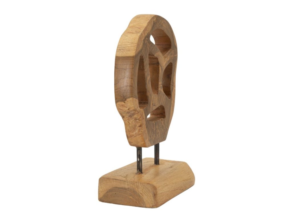 Mini socha z recyklovaného teakového dreva očaruje svojimi zaoblenými tvarmi a elegantnými, hladkými otvormi. Každá línia a krivka evokuje ľahkosť a jemnú rafinovanosť, pričom teplo prírodného dreva dodáva soche jedinečnosť a emocionálnu hĺbku.