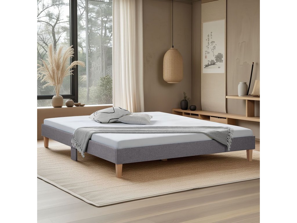 Moderná dizajnová posteľ Futonova v štýle futonového lôžka prináša pokojný spánok a mimoriadne pohodlné noci. Sivá tkanina s textúrou, ktorou je rám čalúnený, sa dokonale hodí do každej spálne, hosťovskej izby, študentskej izby či moderného podnájmu.