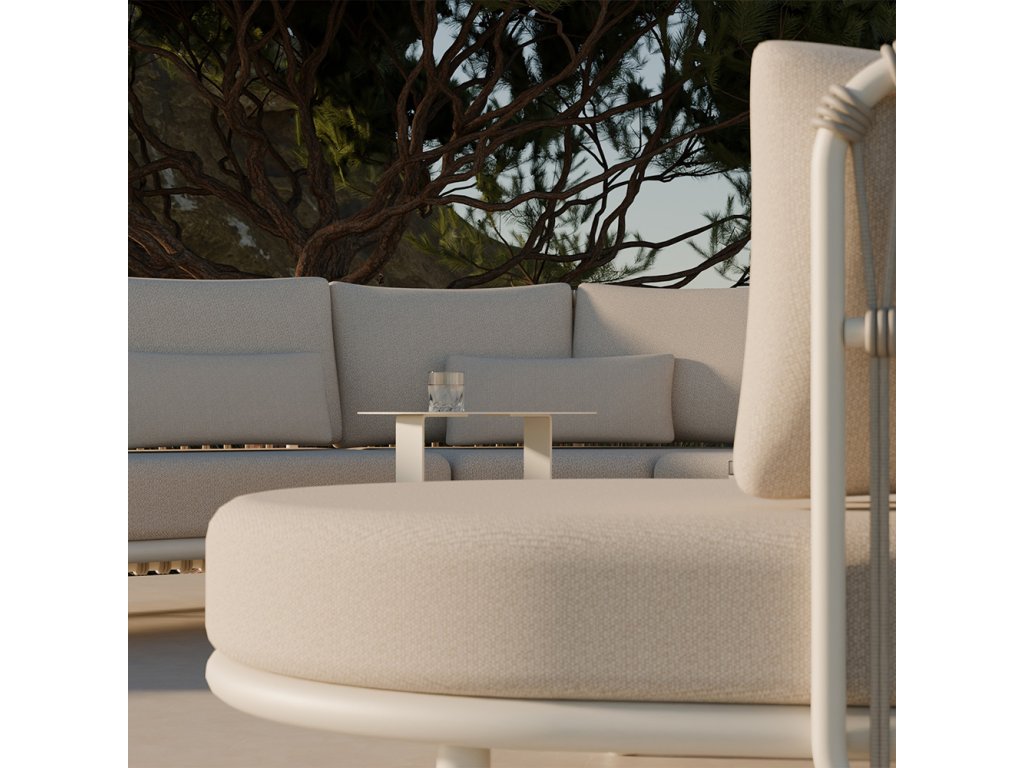 Konštrukcia modulov je z odolného hliníka, hlavná rúra má priemer 32 mm a hrúbku 1,4 mm, čo zaručuje stabilitu a dlhú životnosť. Operadlá sú zakončené lanovým výpletom (priemer 10 mm), ktorý dodáva sedacej súprave ľahkosť a moderný vzhľad. Stolíky majú pevný rám z ocele a elegantný minimalistický dizajn.