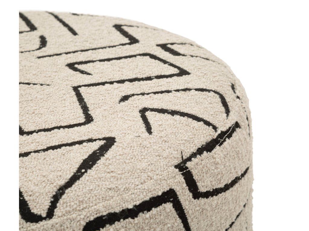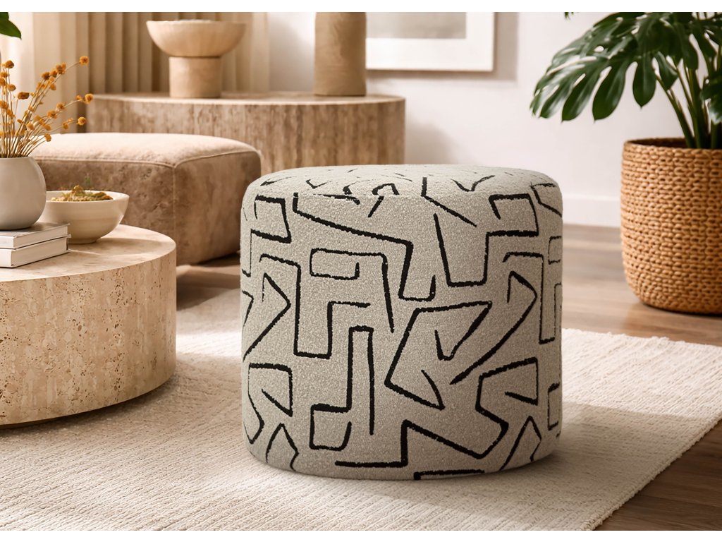 Taburetka Nairobi Pouf je kompaktný a všestranný doplnok, ktorý do interiéru vnáša grafický charakter a moderný štýl. Jej abstraktný vzor v kombinácii bledosivej a čiernej farby okamžite upúta pozornosť a dodáva priestoru sofistikovaný a súčasný akcent. Minimalistická a čistá forma robí z Nairobi Pouf ideálny dizajnový prvok, ktorý vynikne samostatne alebo v kombinácii s ďalším nábytkom.
