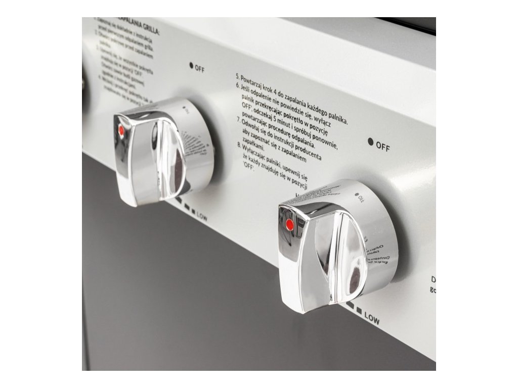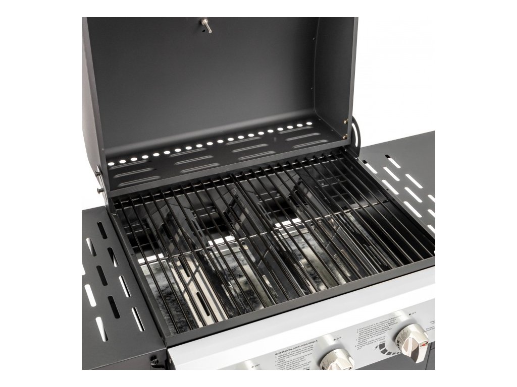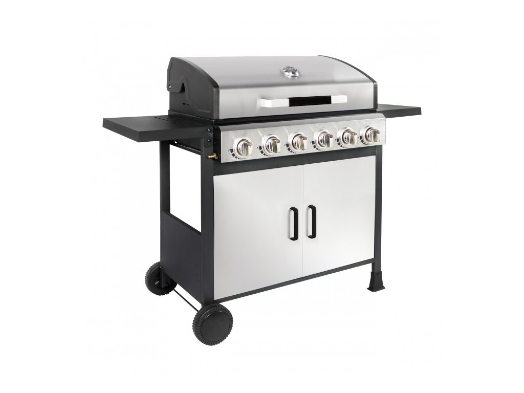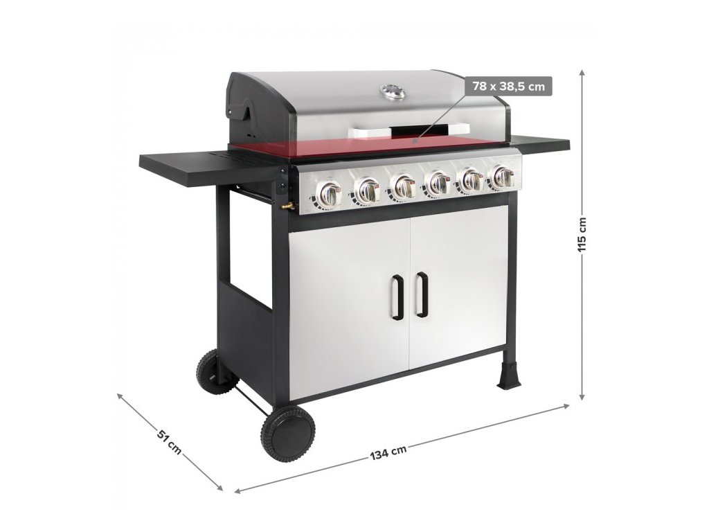 Moderný plynový gril vybavený 6 horákmi umožňuje prípravu viacerých jedál súčasne. Liatinový rošt sa rýchlo zahrieva, takže zariadenie je takmer okamžite pripravené na prácu. Dobre tiež vedie teplo, čo sa následne premieta do kvality hotových jedál. Je vybavený sklopnými bočnými policami, na ktoré si môžete odložiť príslušenstvo potrebné na varenie, čo zvyšuje pohodlie pri grilovaní. V spodnej časti sa nachádza uzamykateľná skrinka, kam môžete umiestniť plynovú fľašu, čo zaisťuje vhodnú estetiku. Súprava obsahuje redukciu potrebnú na pripojenie fľaše.