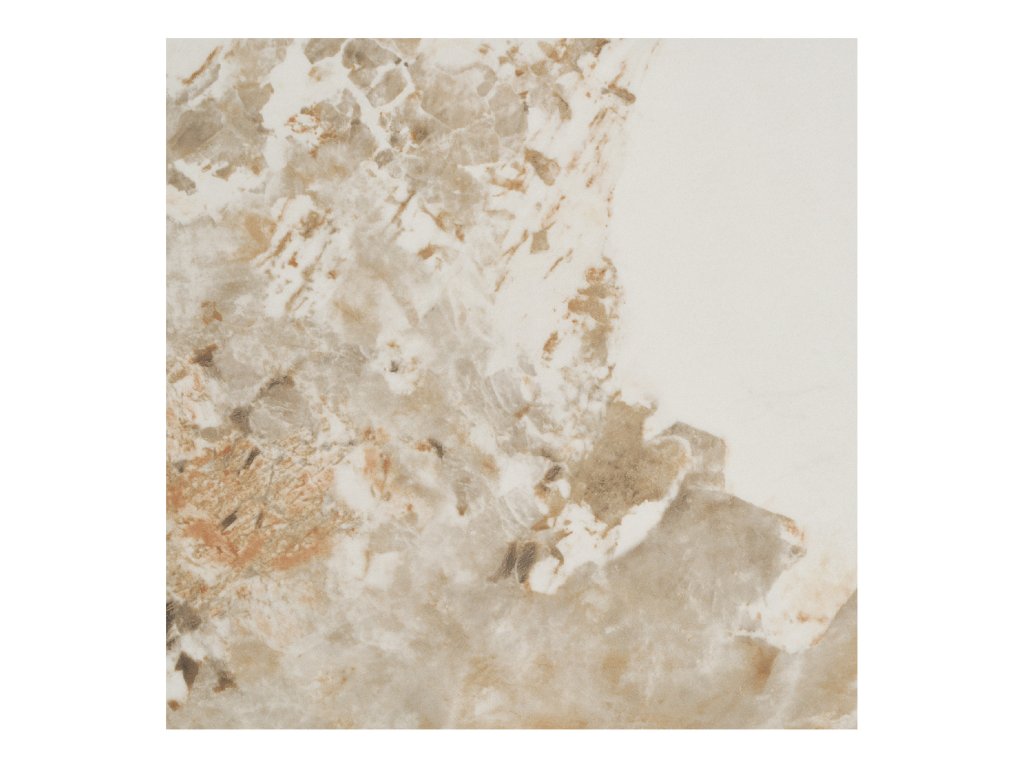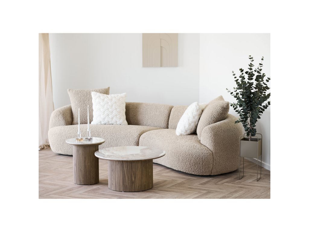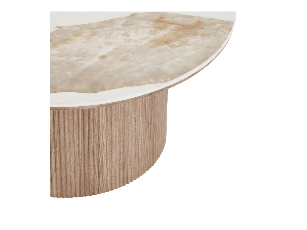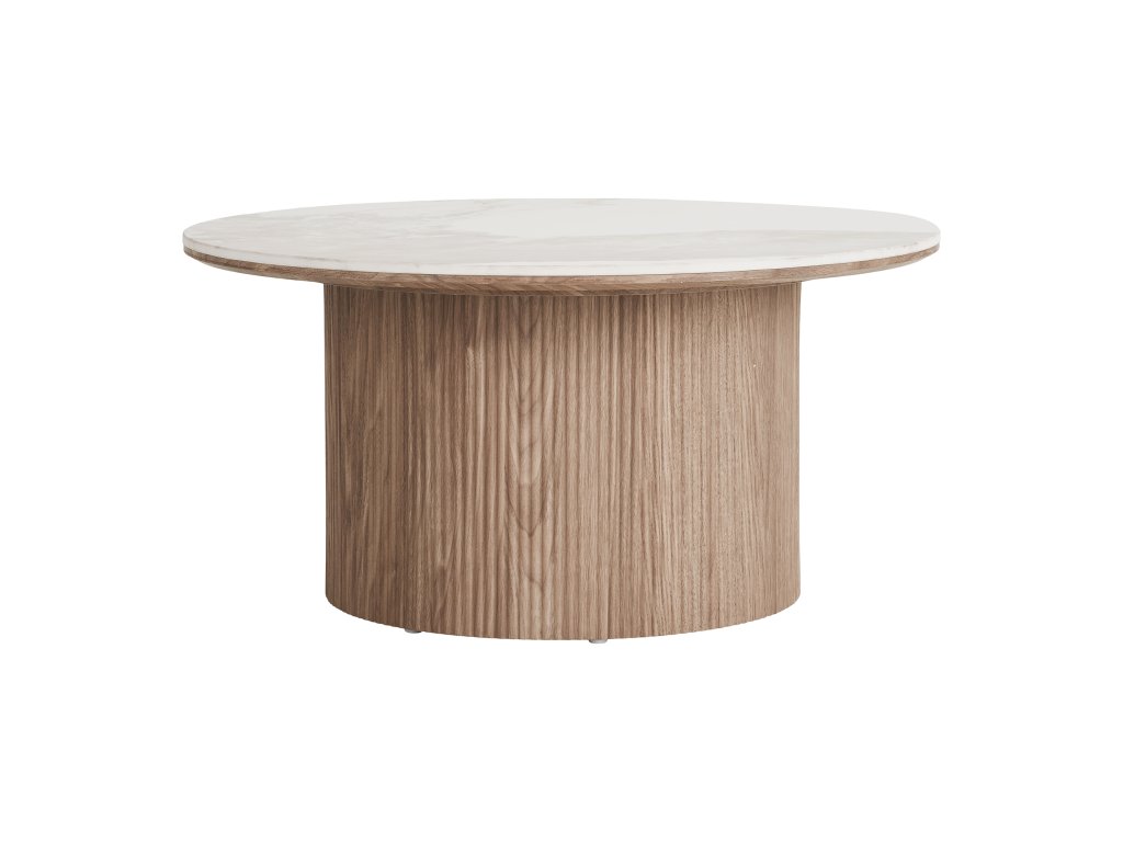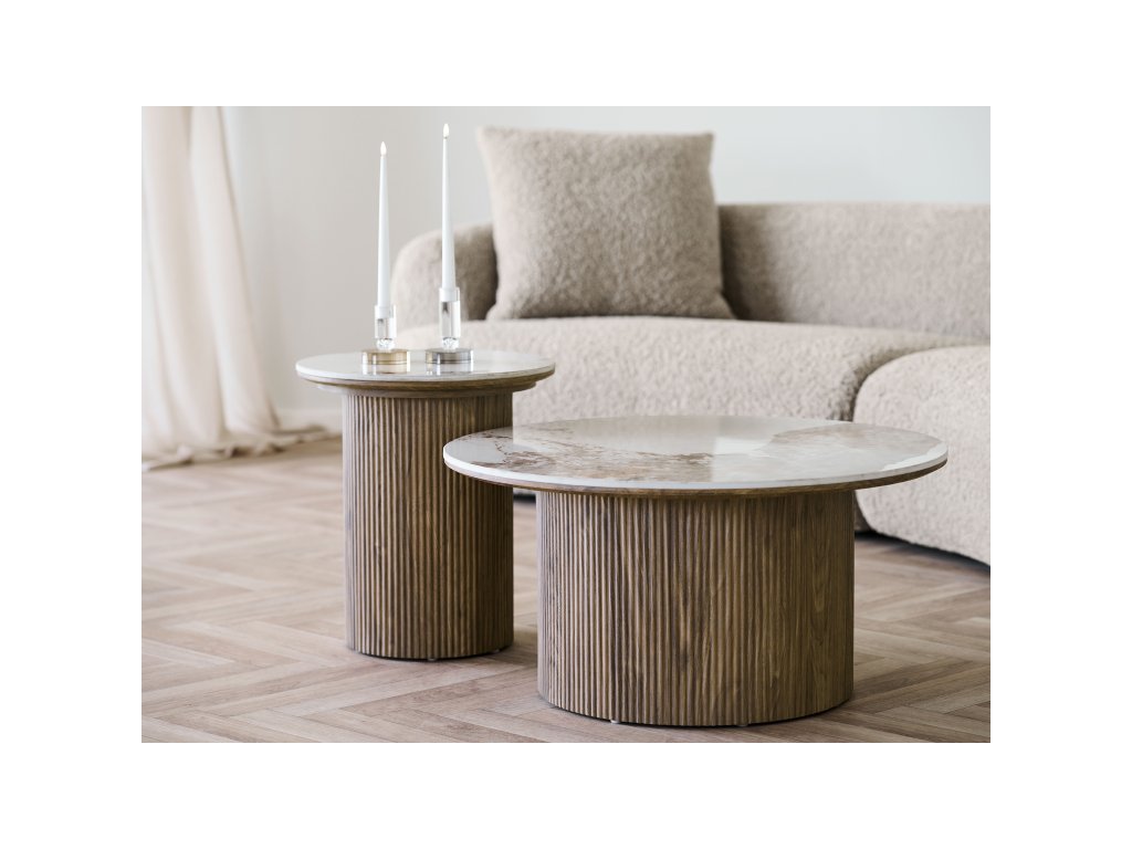 Vrchná doska stolíka je vyrobená z odolnej keramiky v kombinácii s MDF doskou a dekoratívnym povrchom vo farbe bielej a tmavohnedej, čo vytvára štýlový kontrast vhodný do rôznych interiérov – od minimalistických po klasické. Priemer stolíka je 80 cm a výška 40 cm, vďaka čomu sa perfektne hodí pred sedačku alebo do centrálnej časti obývačky.