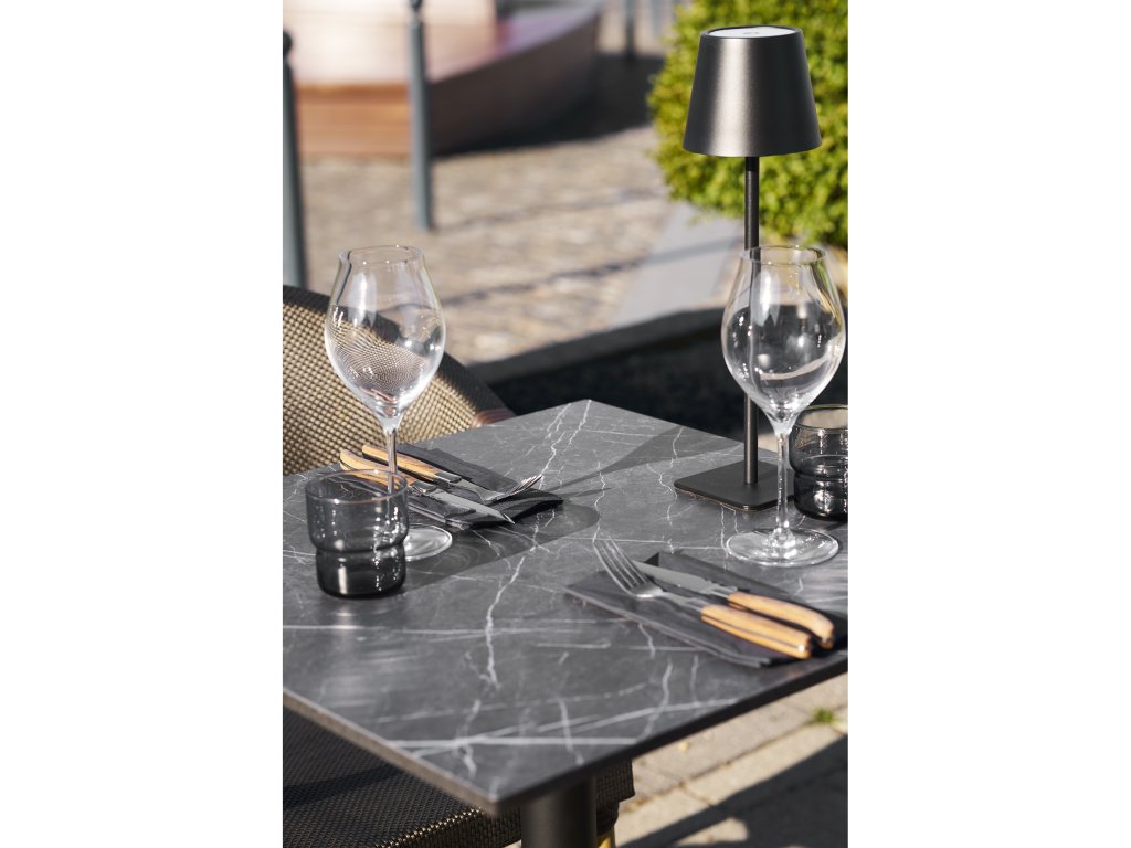 Kombinuje odolný materiál s elegantným dizajnom – stôl má vrchnú dosku v mramorovom vzhľade a stabilné hliníkové nohy v čiernej farbe, ktoré zaručujú pevnosť a trvácnosť. Moderný tmavosivý odtieň dodáva interiéru štýlový a sofistikovaný vzhľad.