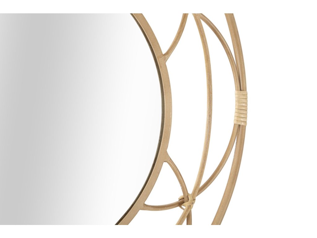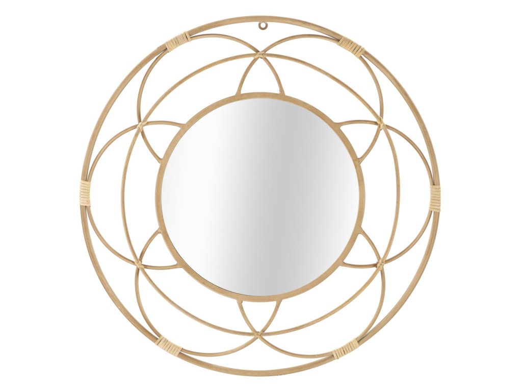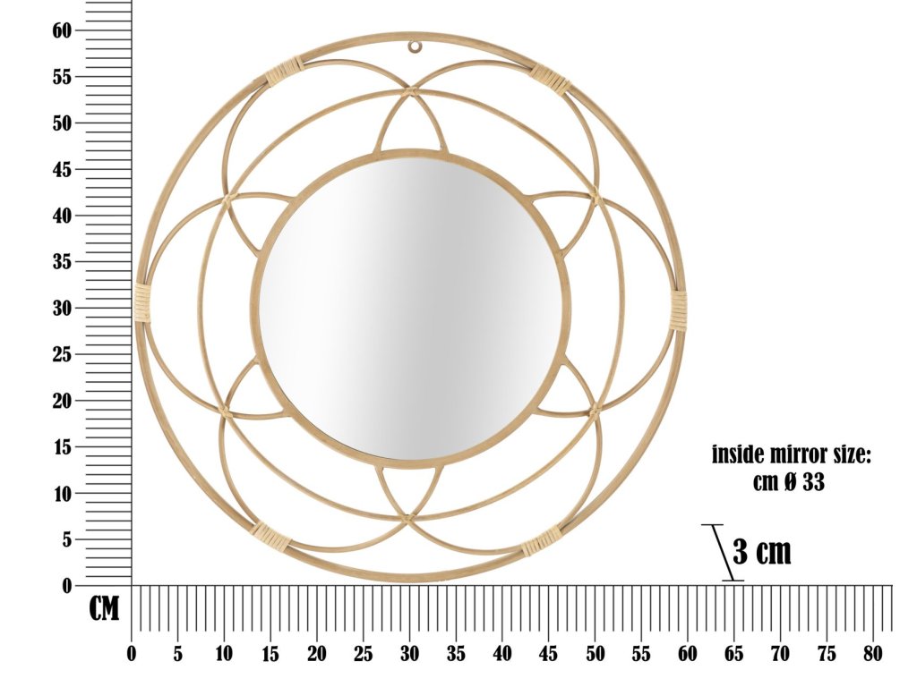 Okrúhle nástenné zrkadlo s rámom vytvoreným geometrickým spracovaním, ktoré pripomína kvet, a zdobené elegantnými ratanovými detailmi. Tento dizajn spája estetiku a funkčnosť do jedinečného kúsku, ktorý vniesie do vášho interiéru jemný prírodný šarm a štýl.