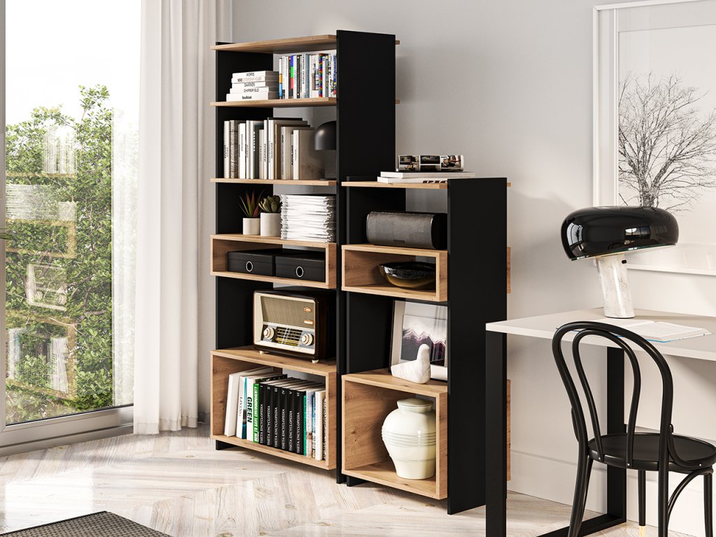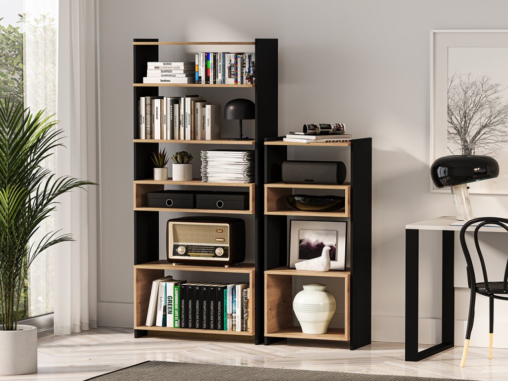 Kompaktnejšia výška robí z tohto regálu ideálne riešenie do menších priestorov alebo ako doplnok k ďalšiemu nábytku. Poskytuje dostatok úložného priestoru na knihy, dekorácie, dokumenty či každodenné predmety. Otvorené police zabezpečujú jednoduchý prístup a prehľadné usporiadanie.