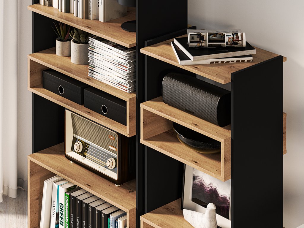 Regál Tris je moderný nízky regál, ktorý sa skvele hodí do obývačky, pracovne aj spálne. Vďaka kombinácii dekoru dub artisan a čiernych prvkov pôsobí elegantne a zároveň industriálne, takže zapadne do moderných aj loftových interiérov.