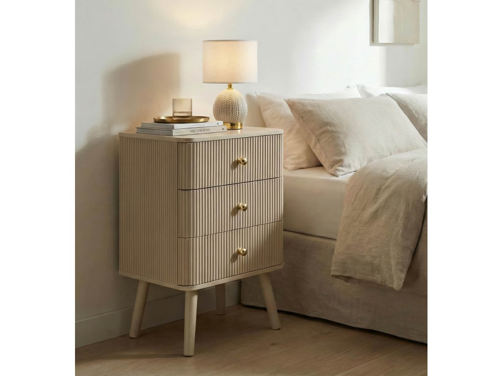 Nočný stolík Shy s tromi zásuvkami – elegantný úložný priestor do spálne