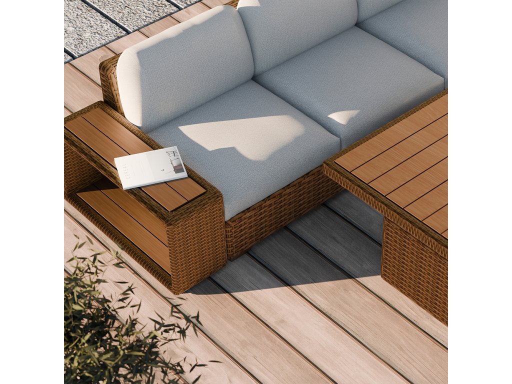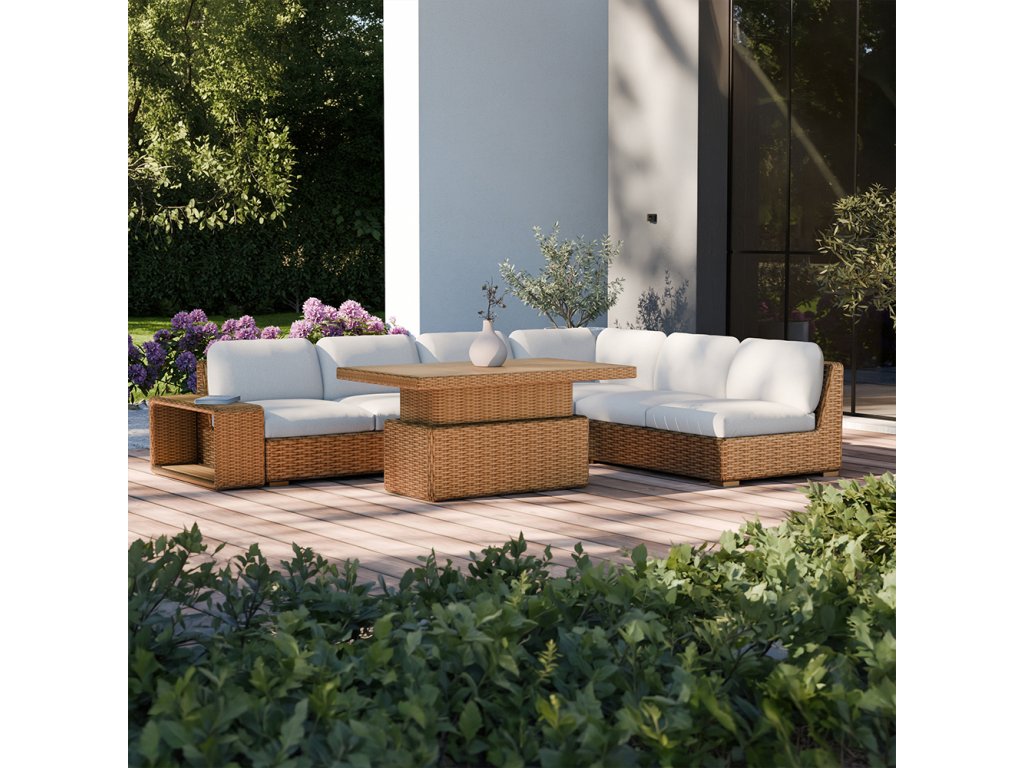Súprava Porto obsahuje trojsedačku, rohovú pohovku, konferenčný stolík s nastaviteľnou doskou a bočný stolík, ktoré spoločne vytvárajú harmonickú a praktickú relaxačnú zónu pre rodinu aj priateľov. Je ideálna na letné posedenia, spoločenské stretnutia alebo pokojné chvíle oddychu pri káve či knihe.