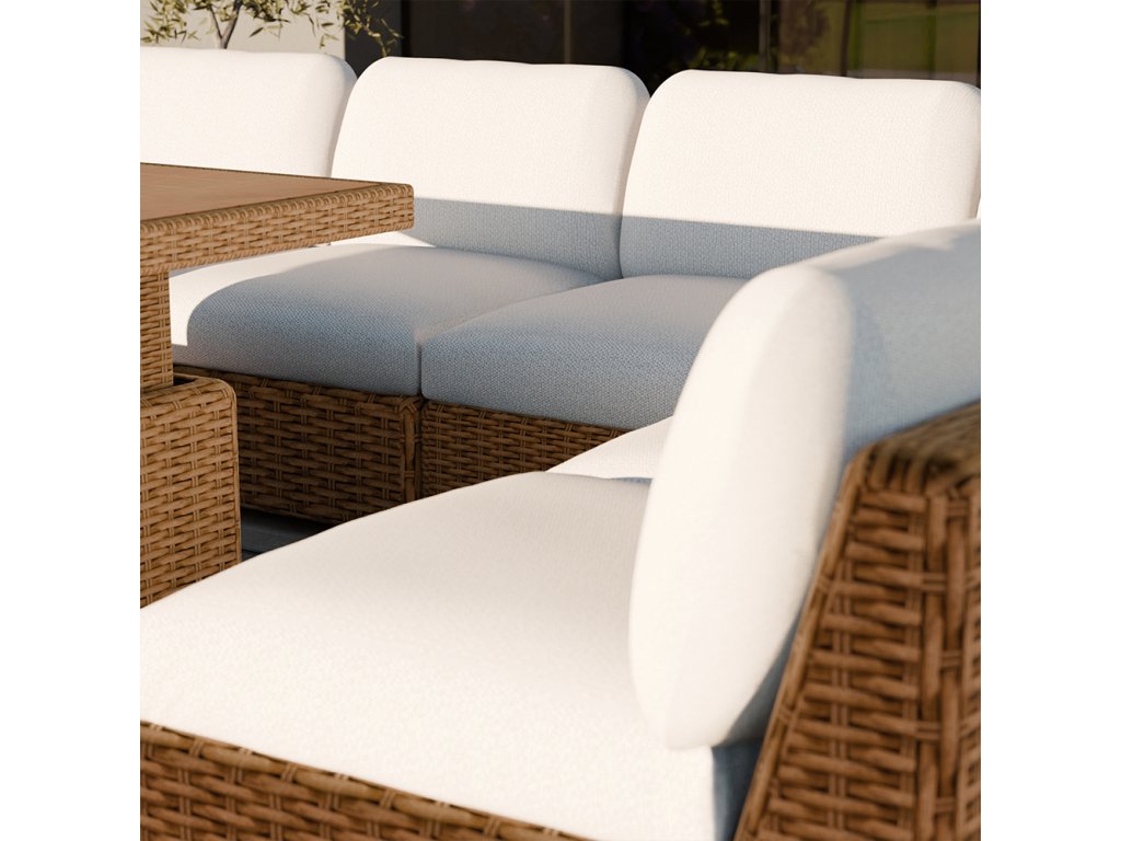 Komfortné vankúše z olefínovej látky sú vodeodolné, UV odolné a majú praktické zipsy pre jednoduchú údržbu. Hrúbka sedáku a operadla poskytuje pohodlné sedenie aj pri dlhšom relaxe, zatiaľ čo modulárne prevedenie umožňuje flexibilne usporiadať priestor podľa vašich potrieb.
