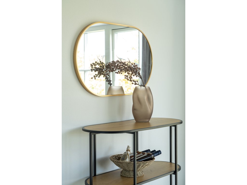 Nástenné zrkadlo Madrid vyniká svojimi zaoblenými líniami, ktoré do priestoru vnášajú pocit pokoja a jemnosti. Jeho hliníkový rám v mosadznej farbe dodáva zrkadlu punc exkluzivity, zatiaľ čo číra odrazová plocha efektívne narába so svetlom. Je to ideálny doplnok pre tých, ktorí chcú oživiť strohý minimalizmus niečím tvarovo zaujímavým a hrejivým.